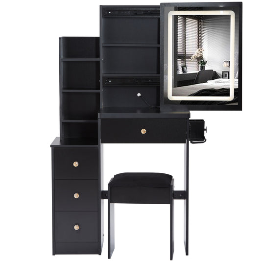 37' Middle Size Left Bedside Cabinet Vanity Table + Cushioned Stool, Large Sliding, Touch Control, Tri-color Switching, Brightness Adjust LED Mirror, High Capacity Storage, Suitable for Middle Space