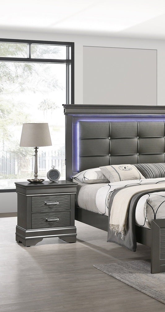 1x Nightstand Solid wood Warm Gray Sleek Modern Lines Chrome Trim Insert Contemporary Bedroom Furniture