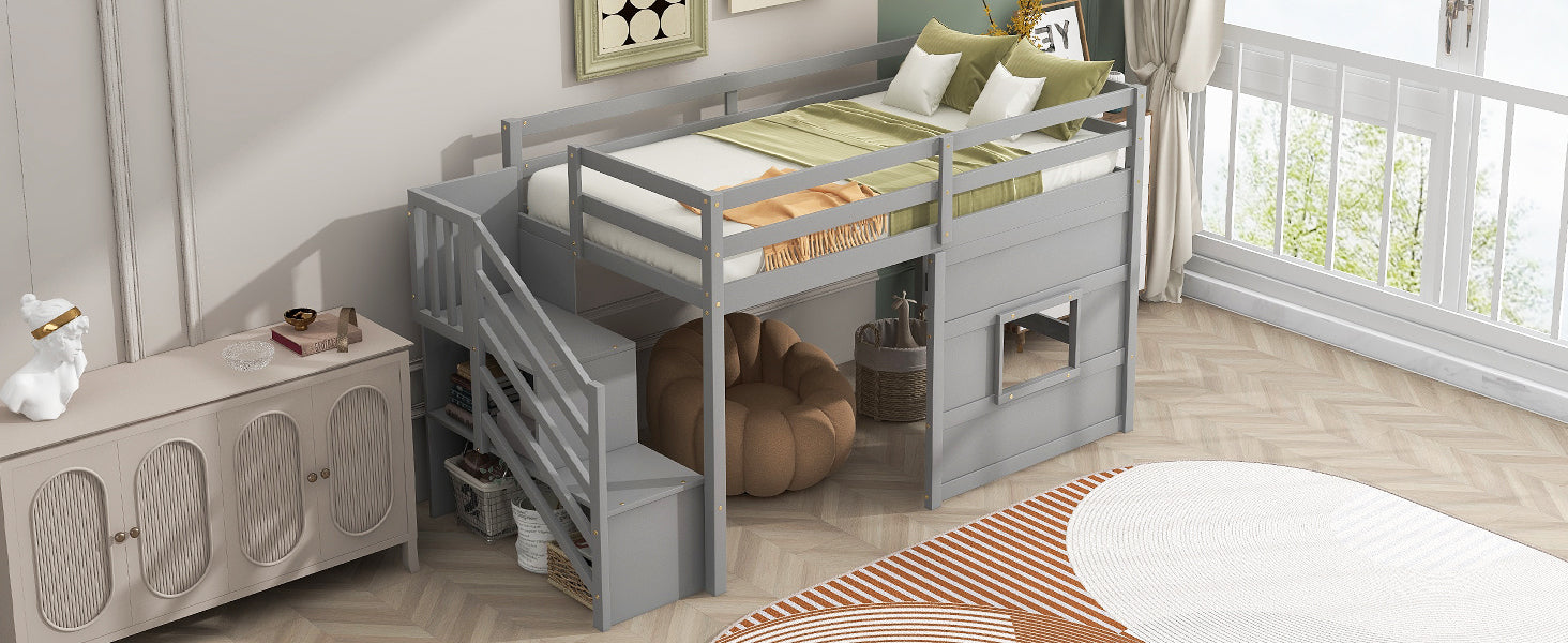 Twin Size Loft Bed with Storage Staircase and Window, Gray