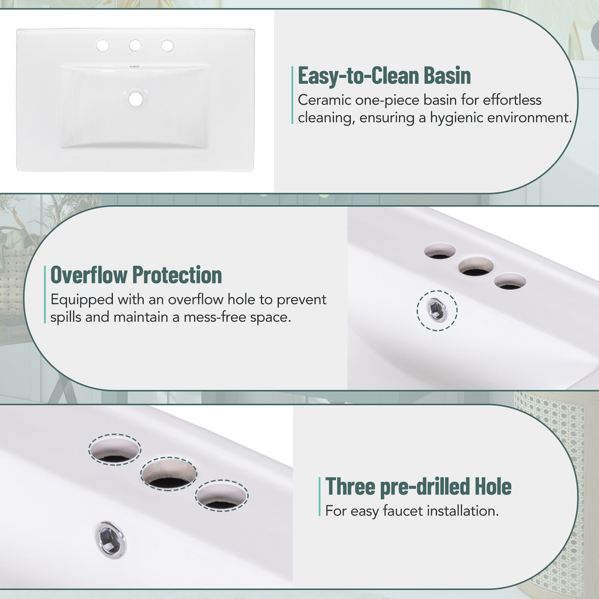 Paired with an inset ceramic sink, our vanity cabinet maximizes space efficiency. The pristine white ceramic sink not only enhances the aesthetic appeal but also offers a smooth surface that is easy to clean and maintain, preventing water stains effectively.