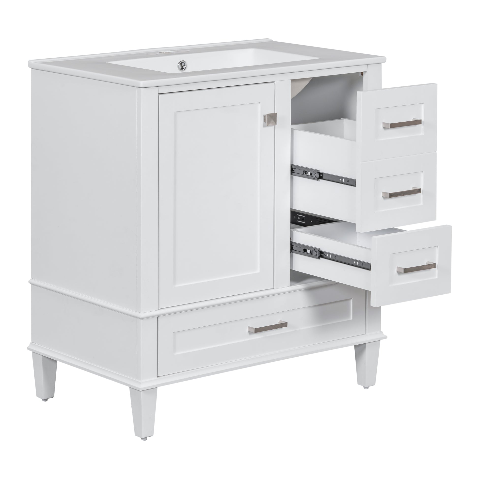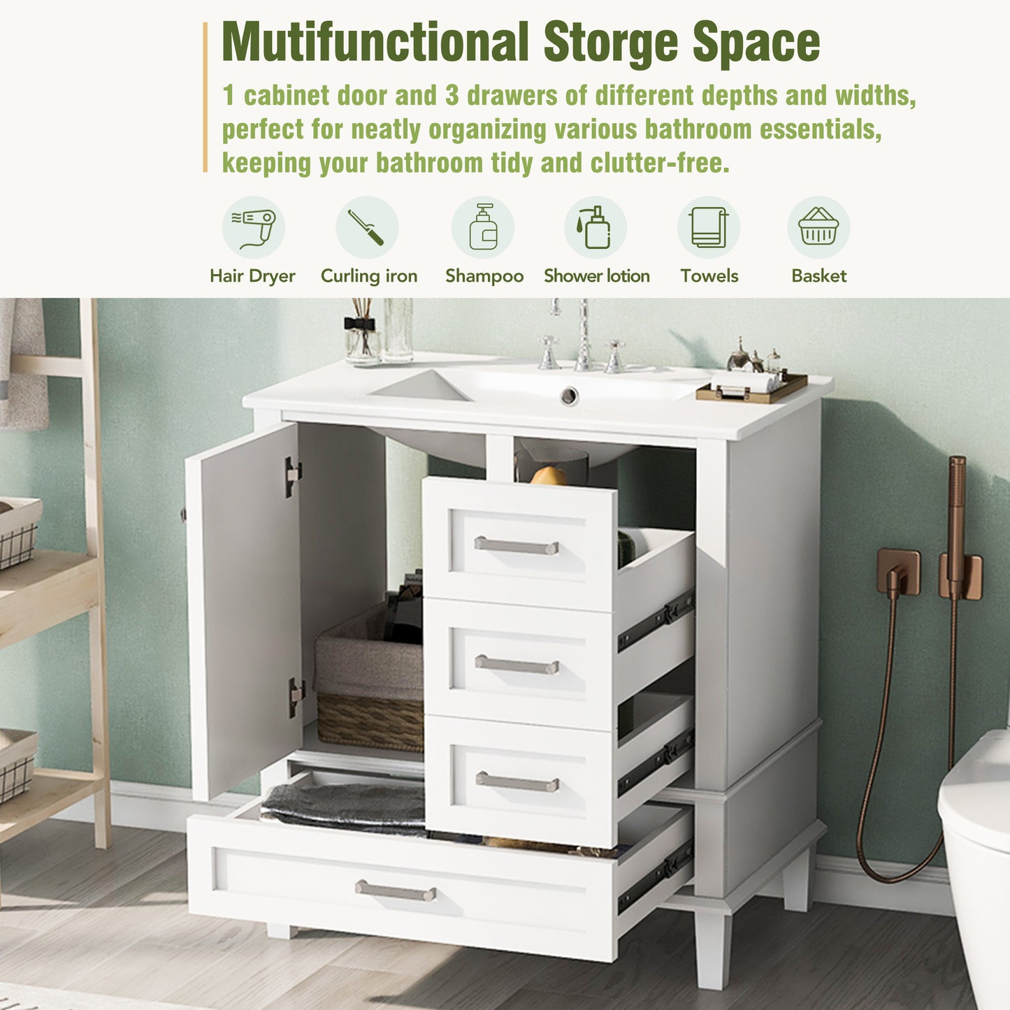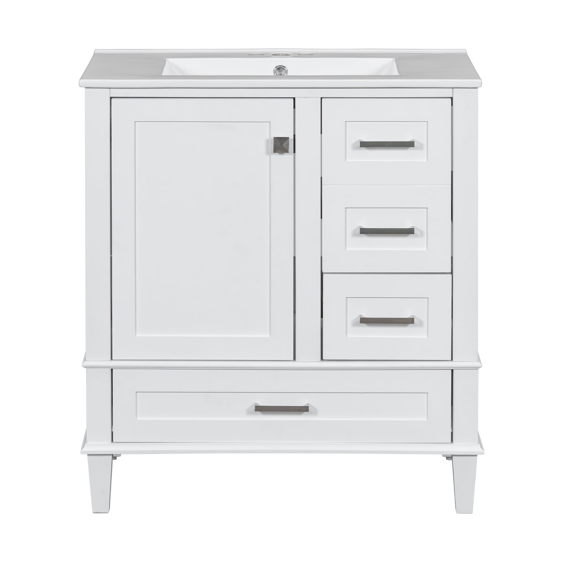 - [Keep Your Bathroom Organized]Equipped with a 30' sink, this bathroom vanity provides ample storage space, featuring 1 cabinet and 3 drawers of different depths and widths, perfect for neatly organizing various bathroom essentials, keeping your bathroom tidy and clutter-free.