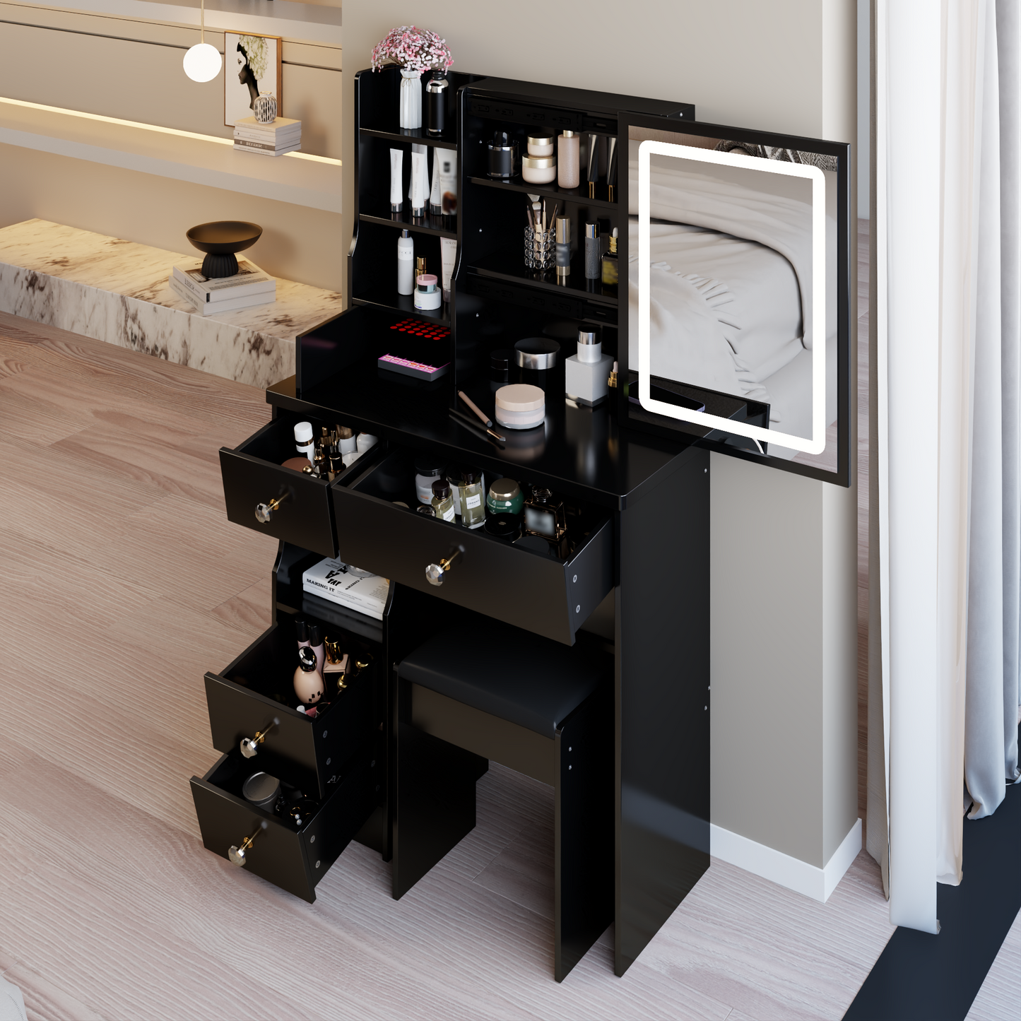 29.2' Small Size Left Drawer Desktop Vanity Table + Cushioned Stool, Large Sliding, Touch Control, Tri-color Switching, Brightness Adjust LED Mirror, High Capacity Storage, Suitable for Small Space