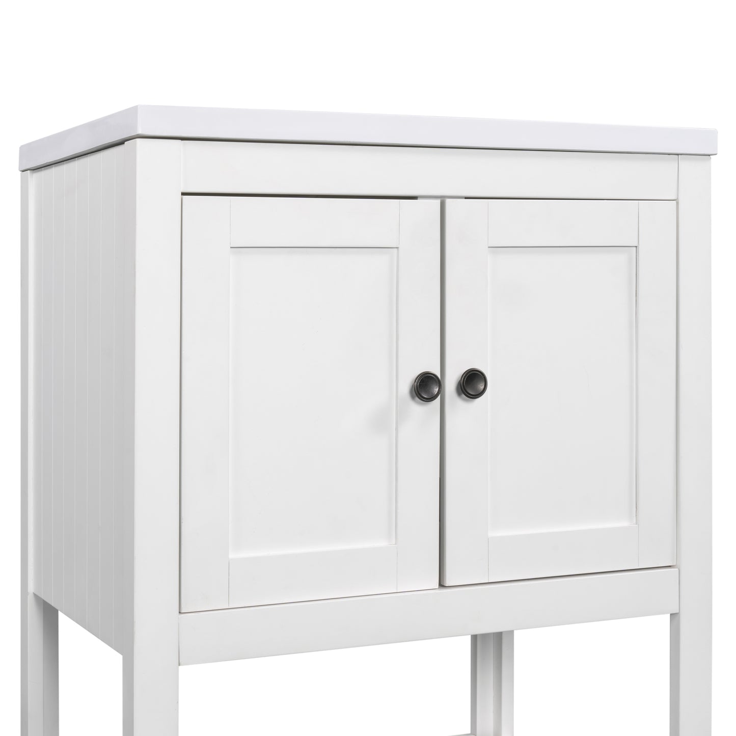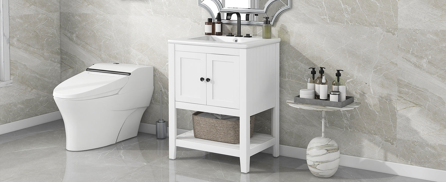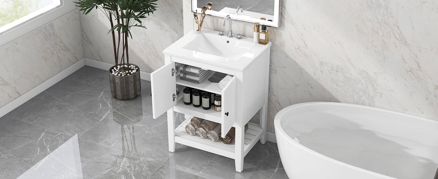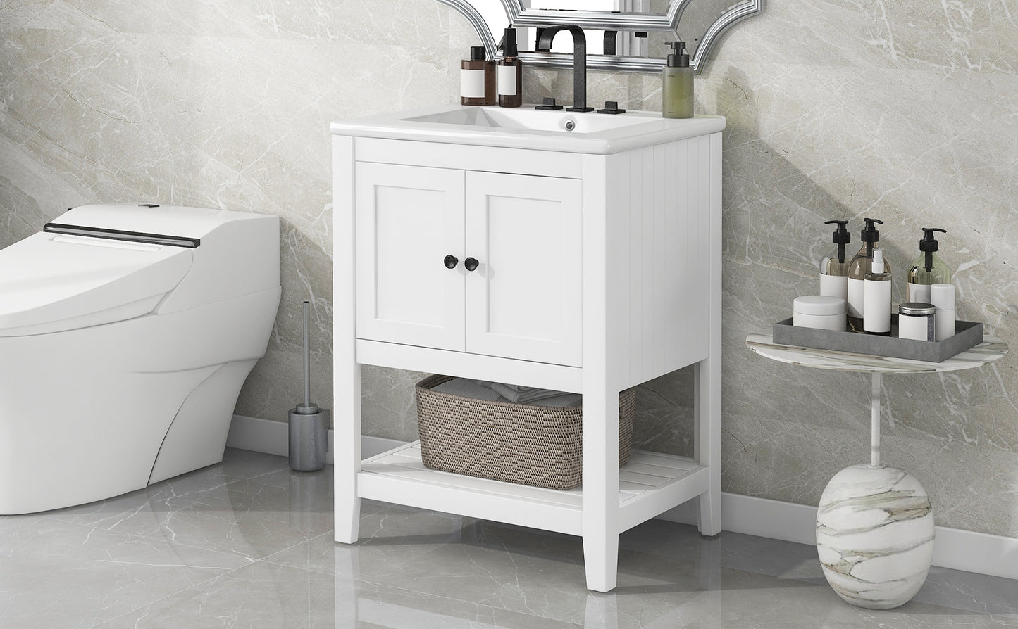 [VIDEO] 24' White Modern Sleek Bathroom Vanity Elegant Ceramic Sink with Solid Wood Frame Open Style Shelf