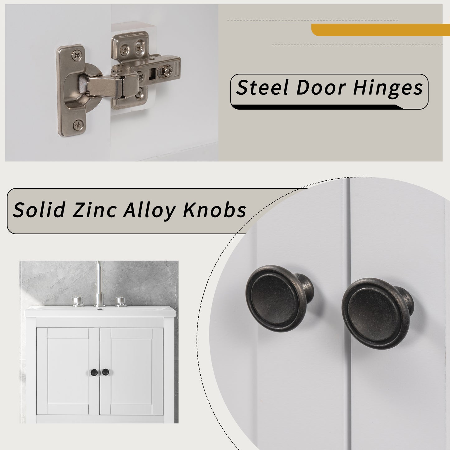 - Solid Wood Frame Construction: This bathroom vanity is made of birch wooden frame and MDF board, and the material of door hinges is stainless steel. These materials are all water-resistant and suitable for humid environment, that will allow longevity of this bathroom vanity lasts long. The round knobs are manufactured with zinc alloy, and the matte finish presents a high-end texture and makes a smooth feeling.