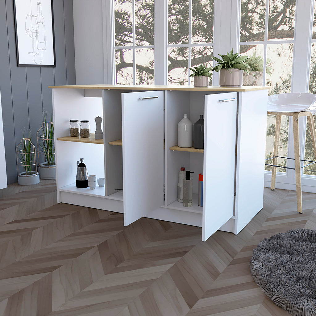 'Enhance your culinary space with the Mercury Kitchen Island. Boasting a spacious 59'' W x 25.1'' D countertop, it's perfect for meal preps or even as a chic dining table. Featuring two open storage shelves (14.8''H x 17.2''W) and dual double-door cabinets with inner shelving, it ensures all essentials are within arm's reach. Crafted with durable white/light oak, black/macadamia, black/onyx and white/onyx finishes, this manufactured wood island blends functionality with modern elegance.