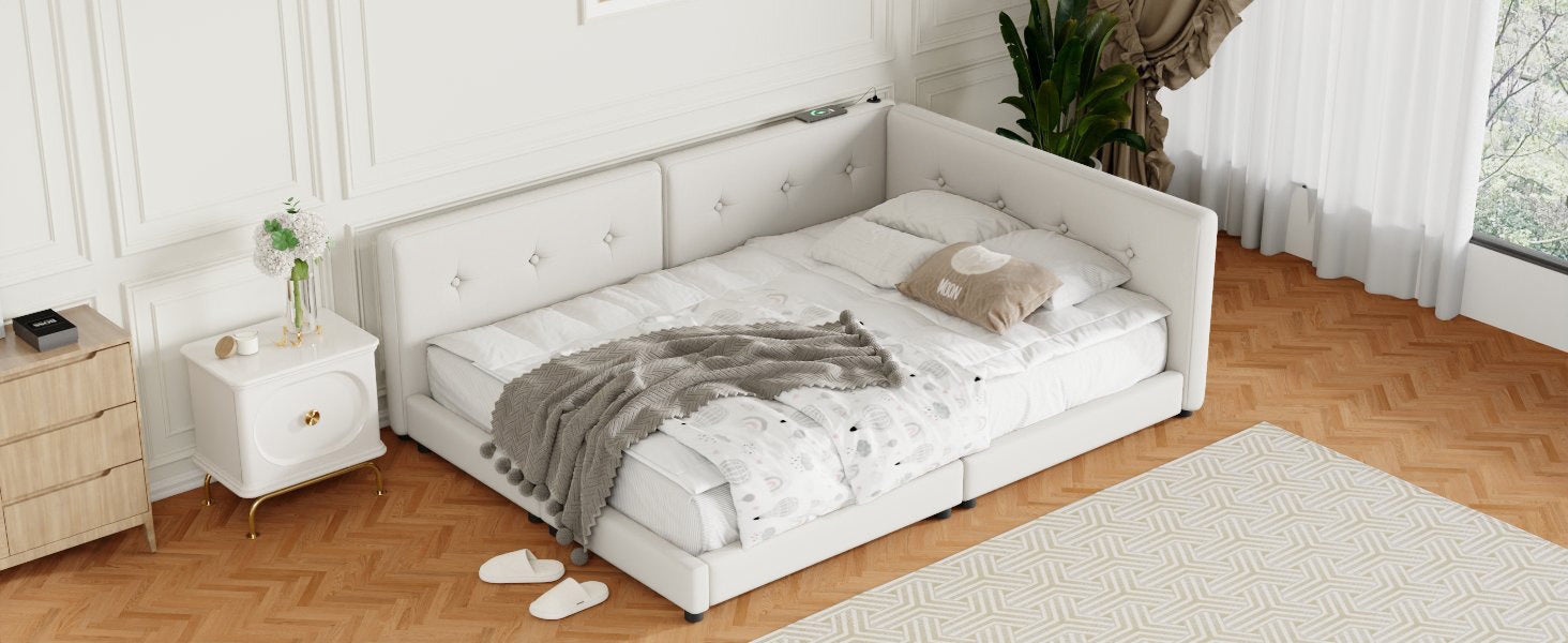 Upholstered Queen Size platform bed with USB Ports, Beige