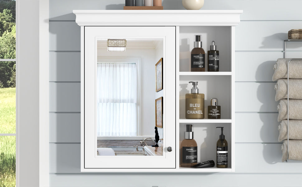 This wall-mounted mirror cabinet is made of high-quality MDF board, which is durable, environmentally friendly and odorless, ensuring long-term stable and reliable use. Equipped with a high-definition mirror, it provides a clear reflection effect, which is convenient for daily grooming. The unique design combines hidden storage and open shelves, which can effectively store sundries and keep them tidy, and display commonly used items. The height of the shelf is adjustable, which can flexibly adapt to the storage needs of different items and perfectly meet your storage needs. Whether it is a bathroom, bedroom or living room, this mirror cabinet can perfectly integrate into your home environment, improving the cleanliness of the space and convenience of use.