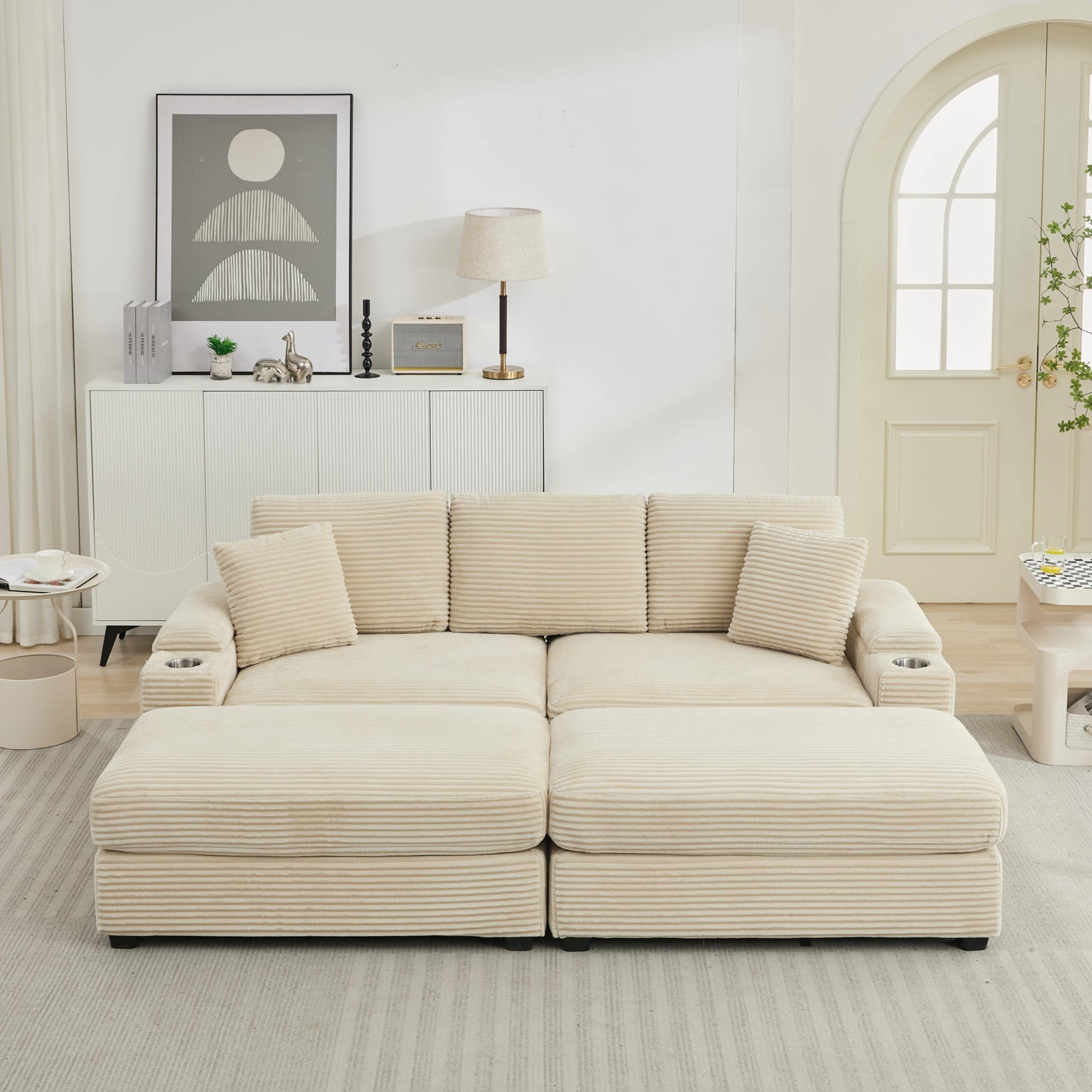 - Superior comfort:Upholstered in high-end breathable corduroy fabric and high-quality sponge, with cushioned thick foam at backrest and seat for prime relaxation. Lean back and stretch out your legs out long on the ottomans when you or guests need more space. Customize the placement of the 2 pillows anywhere you would like to add extra support when sitting after a long day or watching a movie.