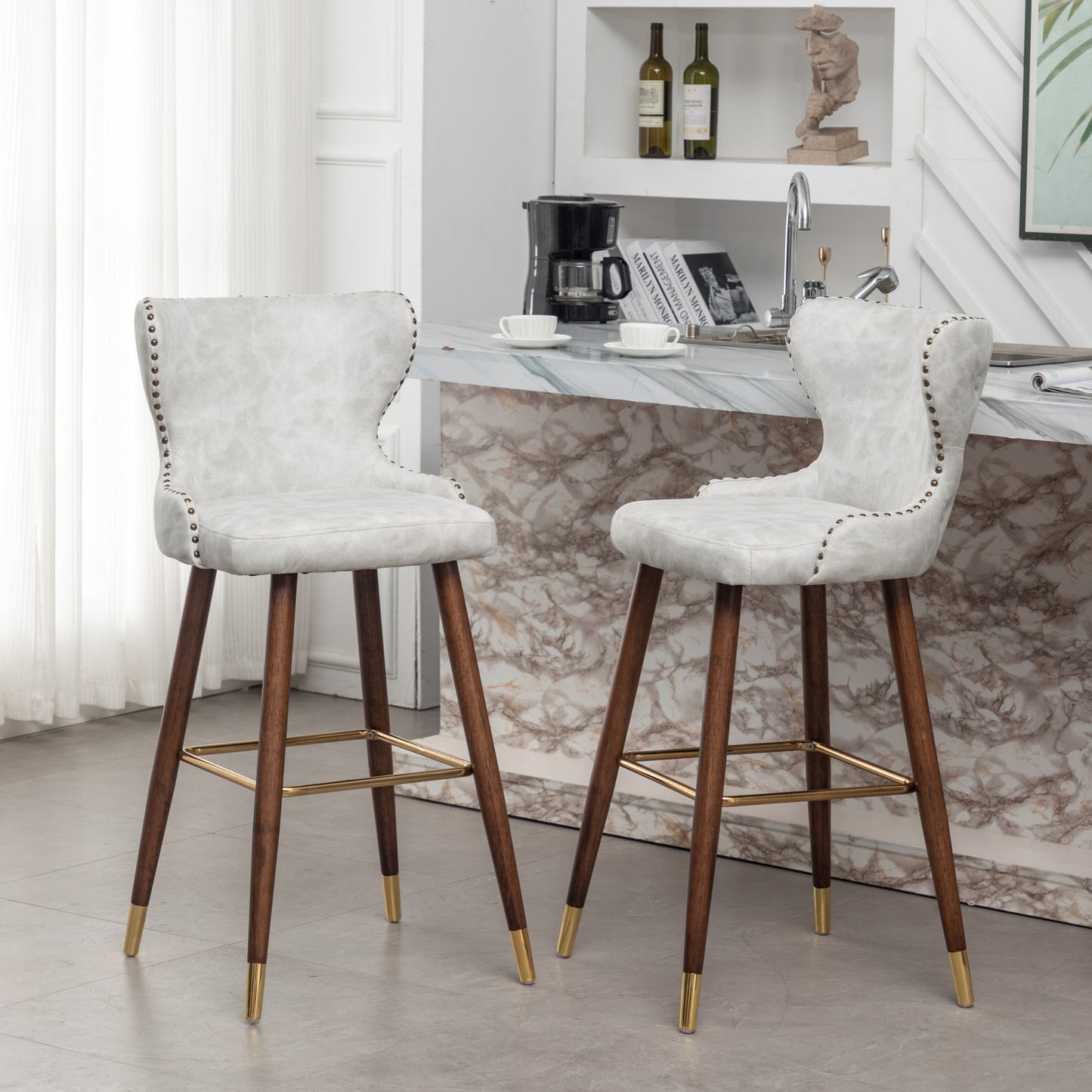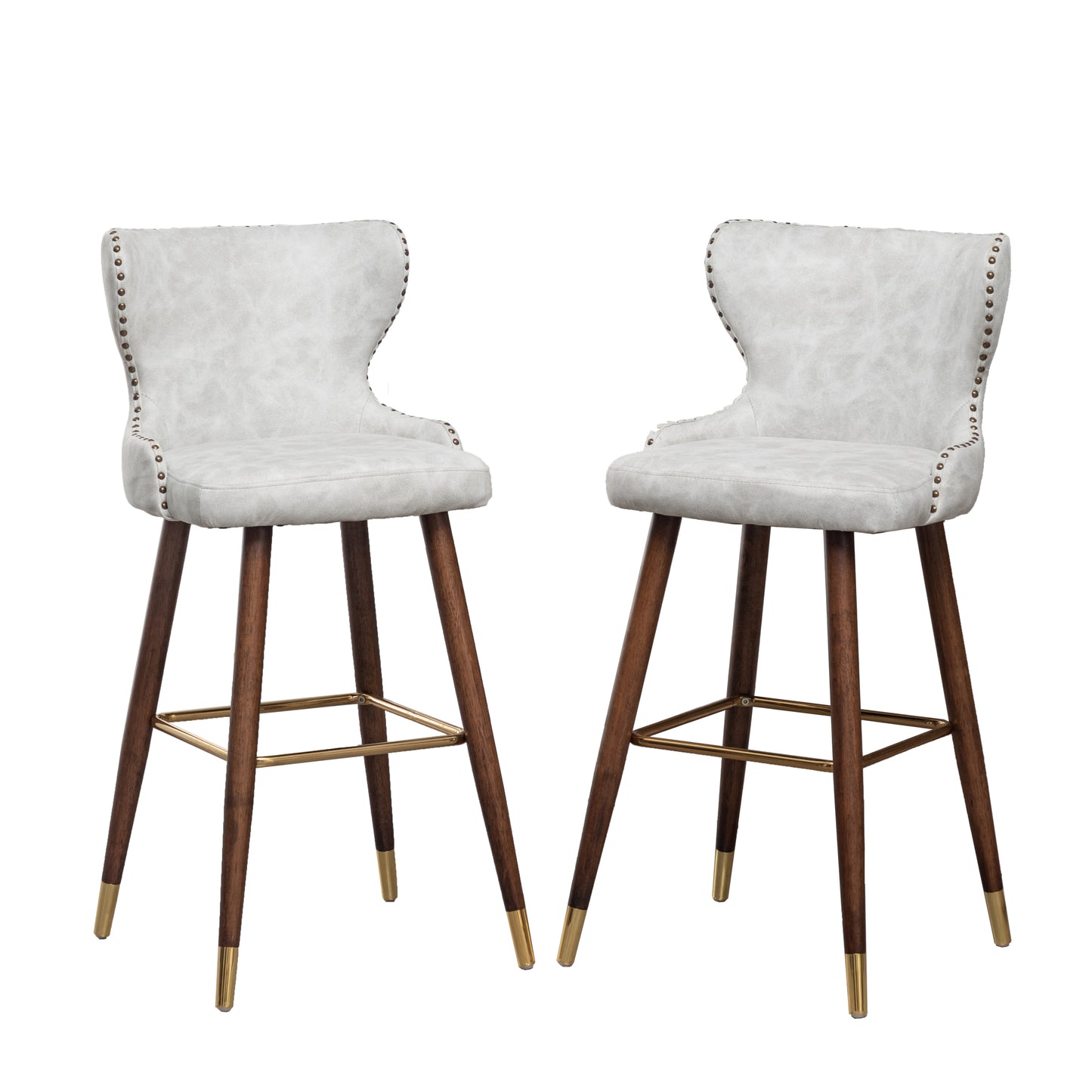 Nevis Mid-century Modern Faux Leather Tufted Nailhead Trim Barstool Set of 2, Off-White