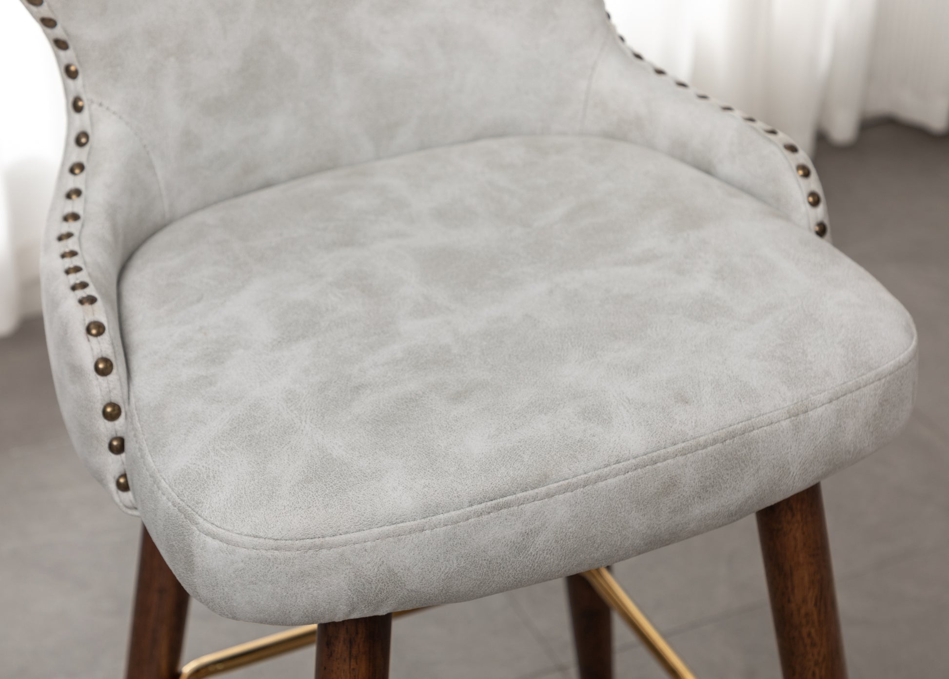 - The set includes two barstools, featuring suede-like fabric upholstery