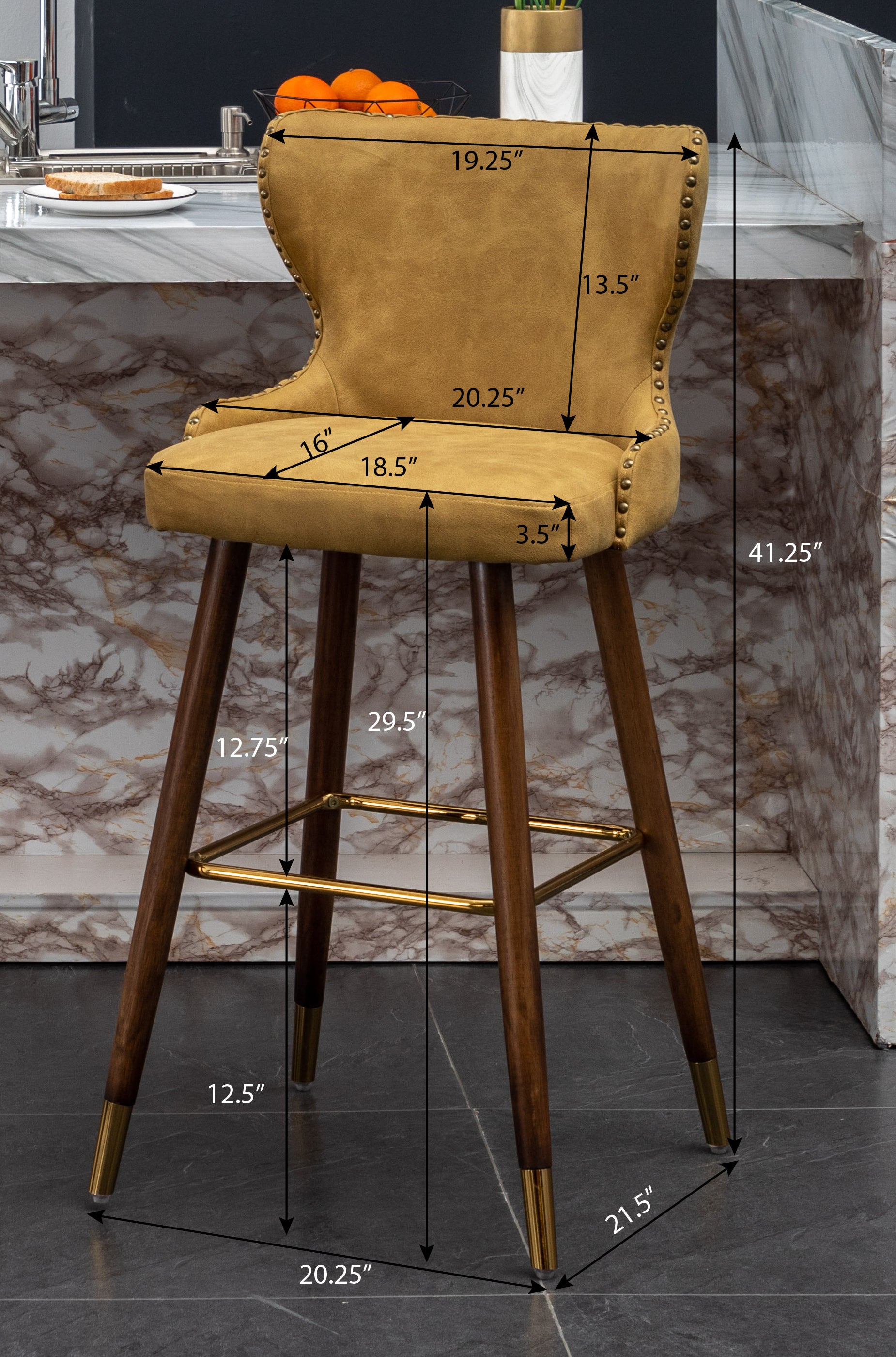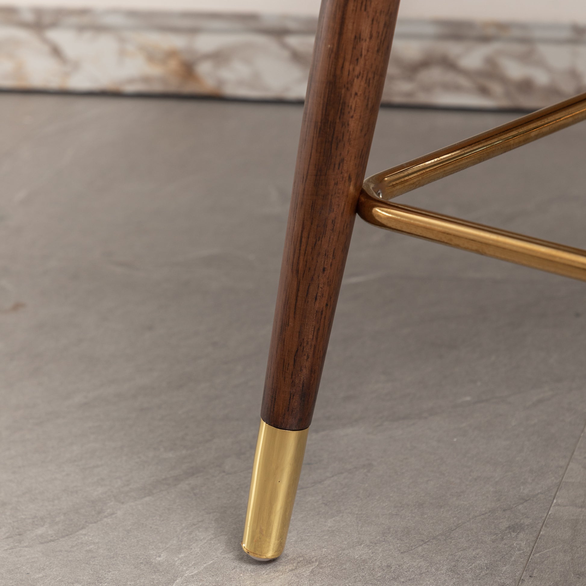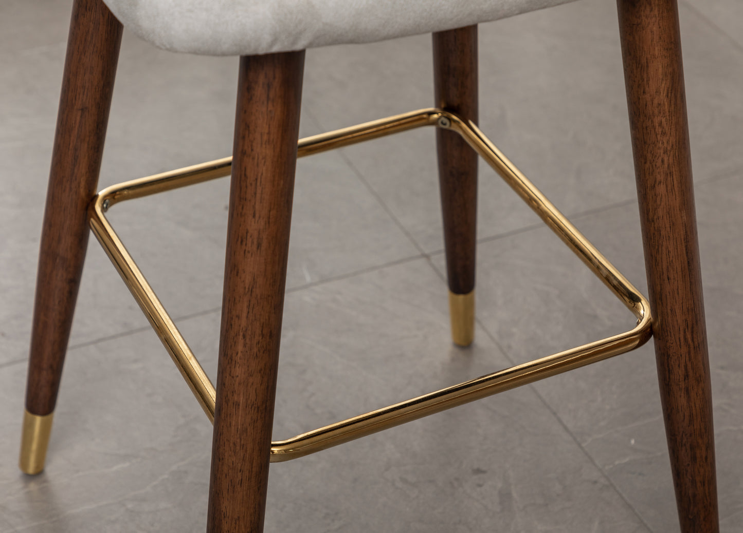 - Tapered walnut finished solid wood dowel legs with gold-finished metal footrest