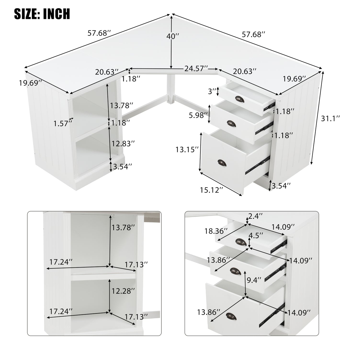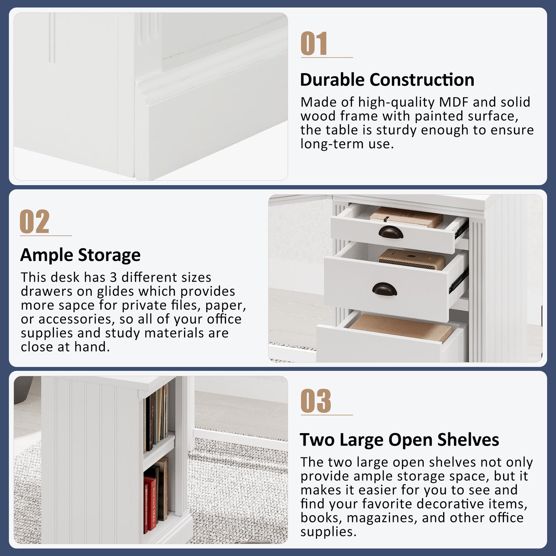 - This desk has 3 different sizes drawers which provides more space for private files,papers,or accessories,so all of your office supplies and study materials are close at hand.