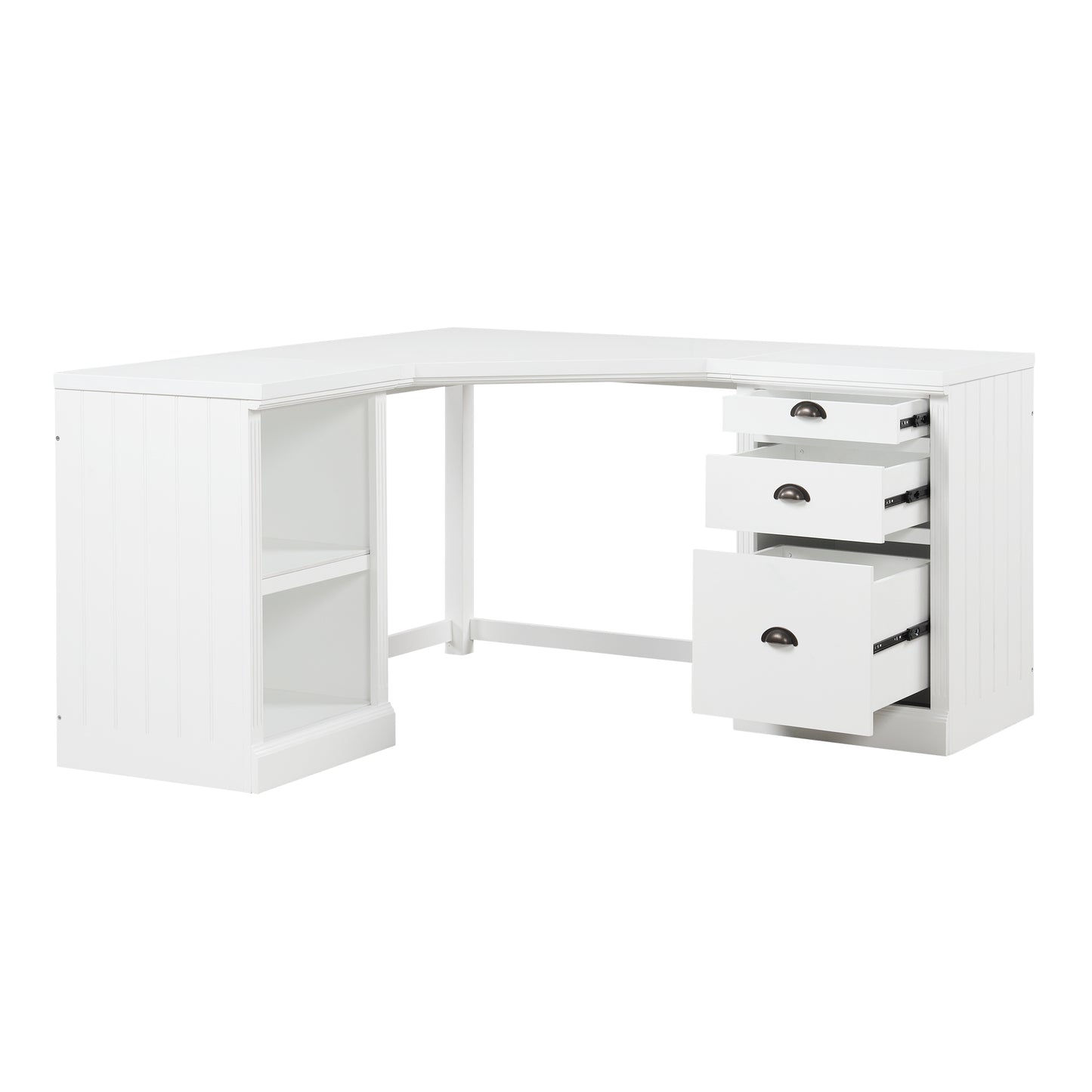 This modern L-shaped desk combines a spacious tabletop, providing ample space for your computer, books, office documents, and other decorative items.