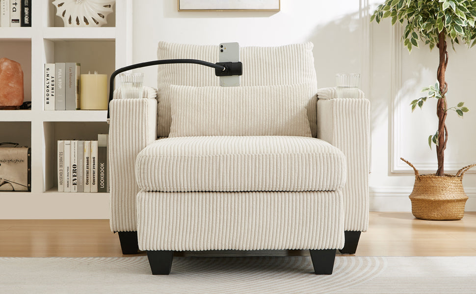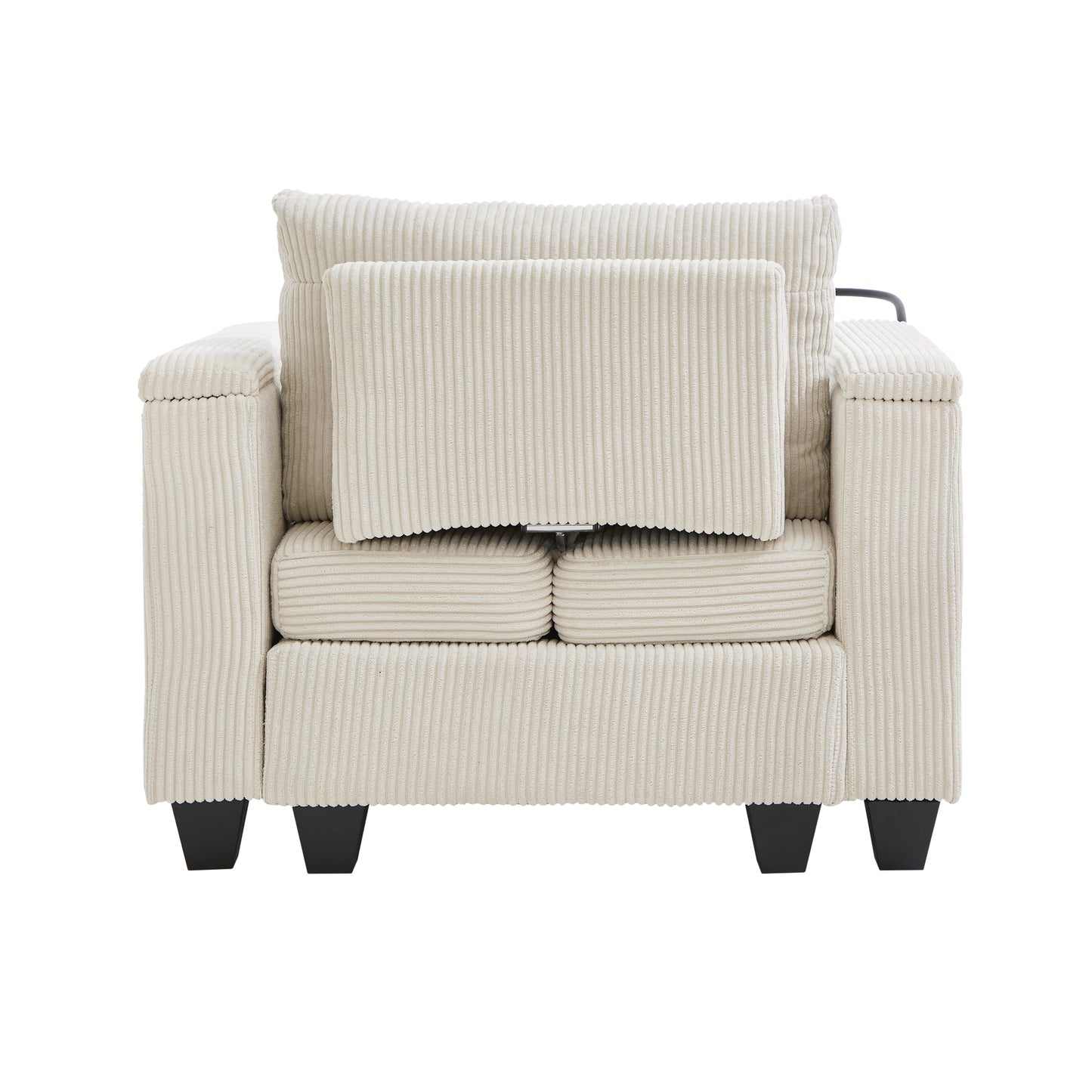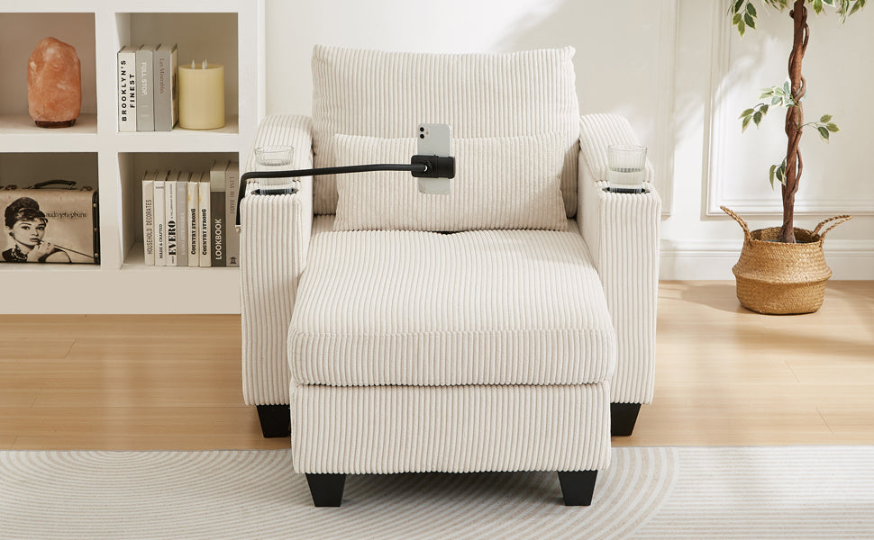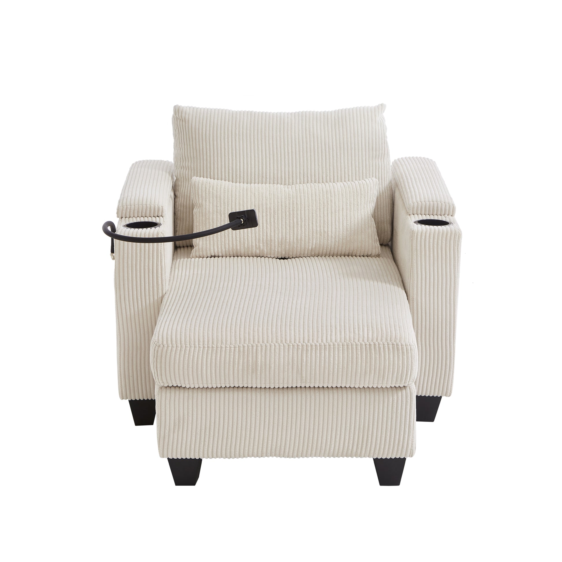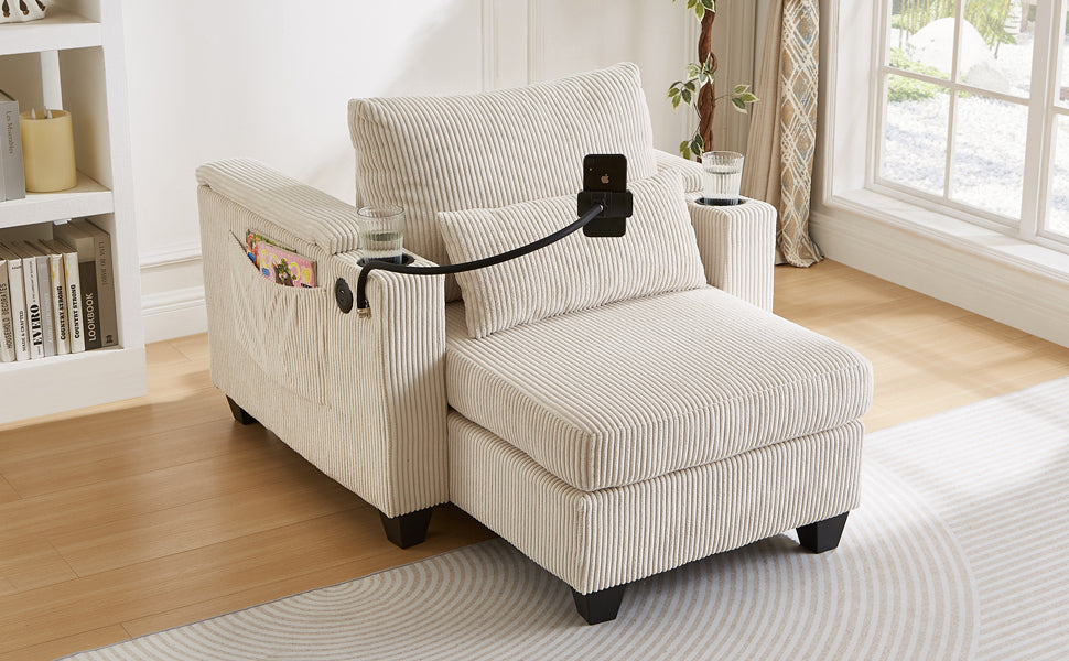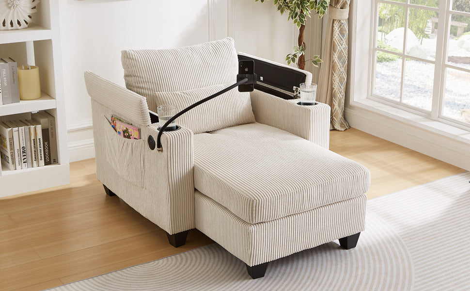 Convertible Chaise Lounge Sofa Chair Sofa Bed with USB Ports, Cup Holders, Phone Holder, and Storage, Beige Corduroy, 37.4'