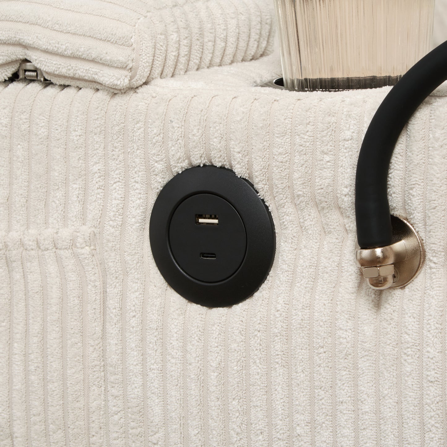 - USB Charging Ports + Flexible Phone Holder - Stay connected and charged while you relax. This sofa features dual USB charging ports built directly into the armrest, allowing you to conveniently charge phones, tablets, or e-readers without leaving your seat. A flexible phone holder is also attached, enabling hands-free viewing for streaming, video calls, or browsing—ideal for tech-savvy users and digital multitaskers.