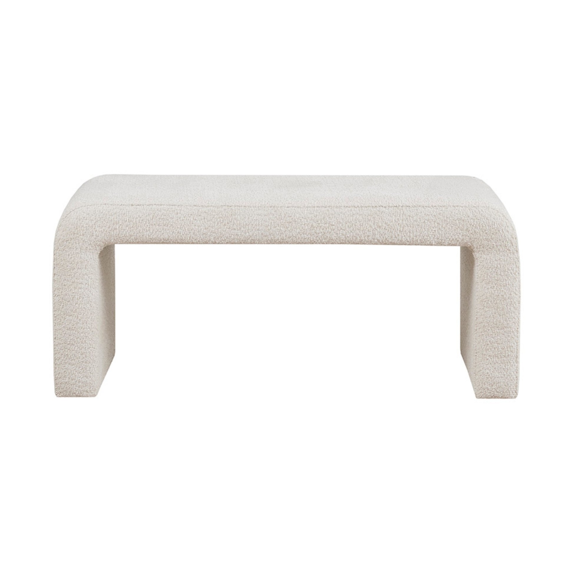 Steve bench has a sleek waterfall design with rounded corners and is upholstered in soft, textured cream-colored boucle fabric. Perfect addition to any modern contemporary home and also provides a comfortable and cozy place to sit while putting on your shoes or in the bedroom as an extra seat. Requires no assembly.