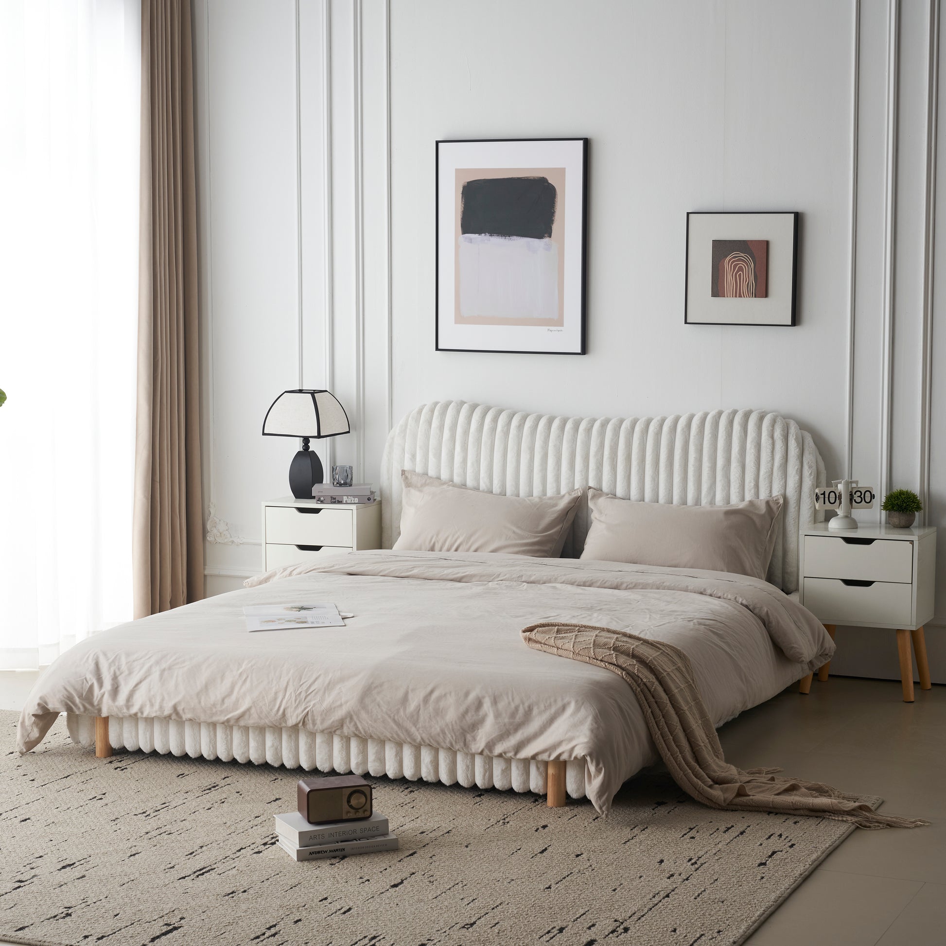 Sleek White Boucle Upholstered Bed with Wavy Headboard & Vertical Stitching, Queen