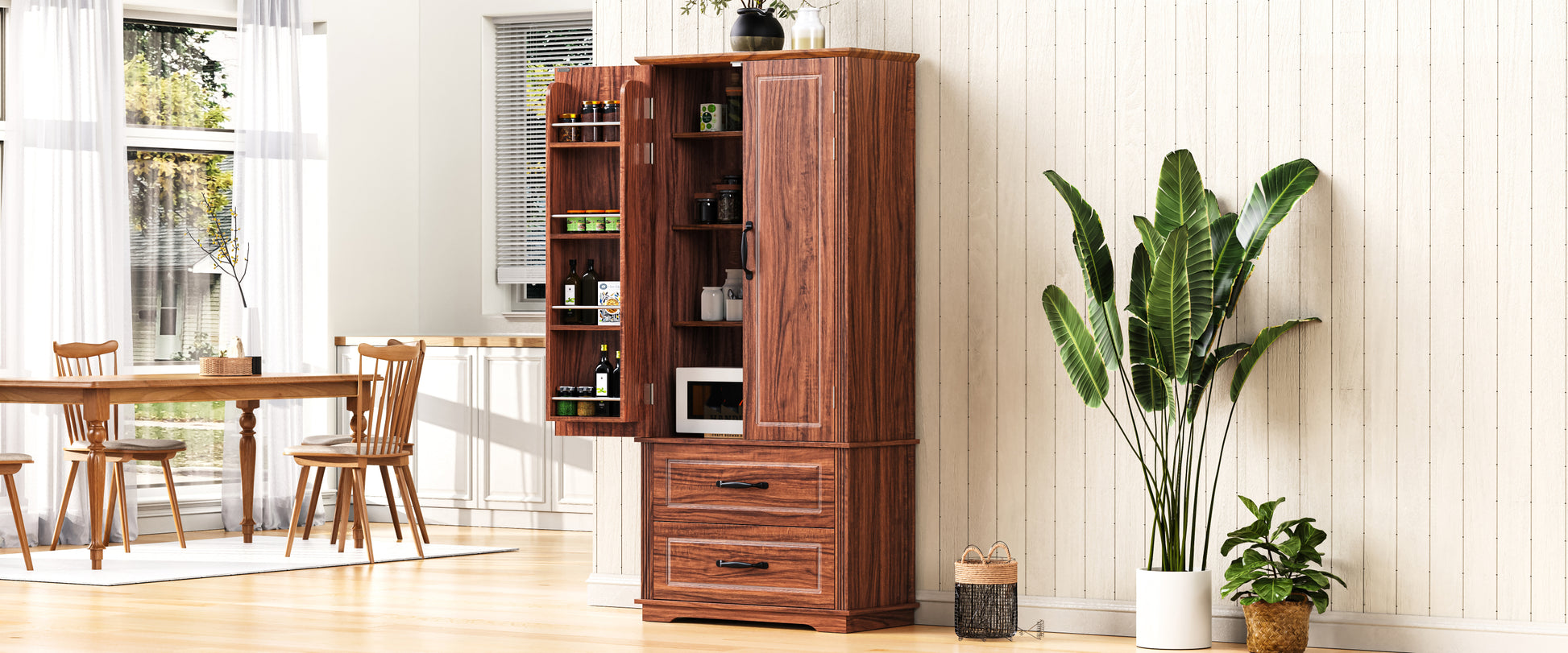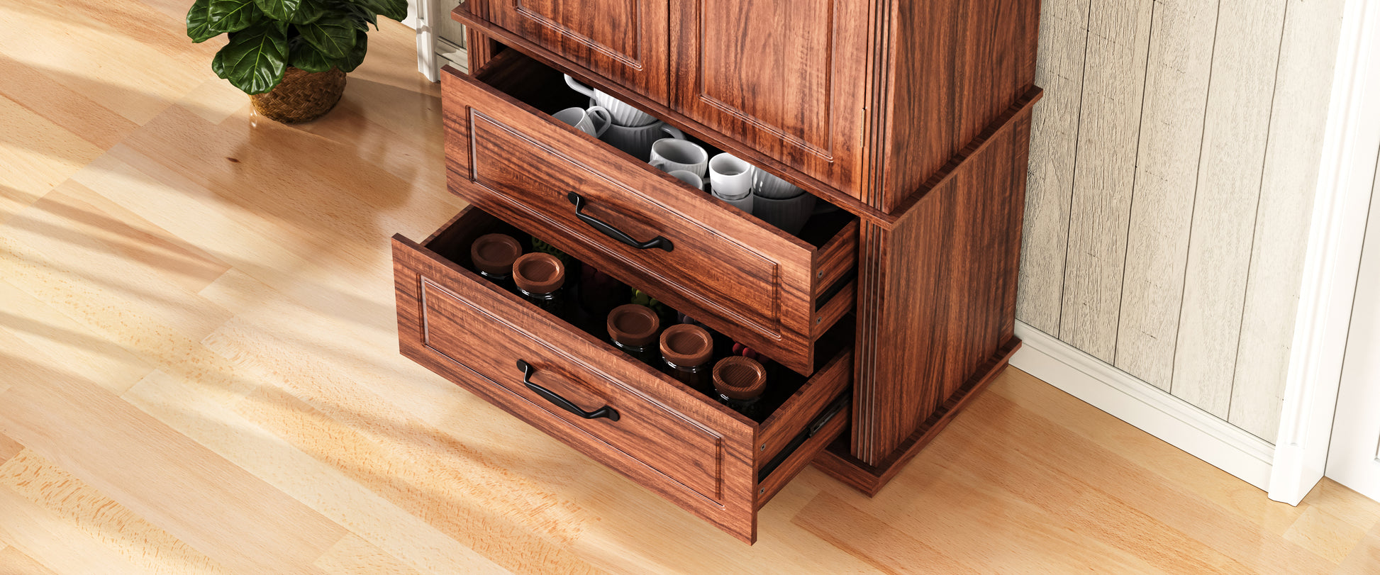 - [Spacious Storage Solution] Boasting 6 storage compartments with 3 adjustable shelves, 2 full-extension drawers, and 8 door shelves, this pantry cabinet from us offers ample storage for your food, dinnerware, and kitchen appliances, keeping your space organized and clutter-free.