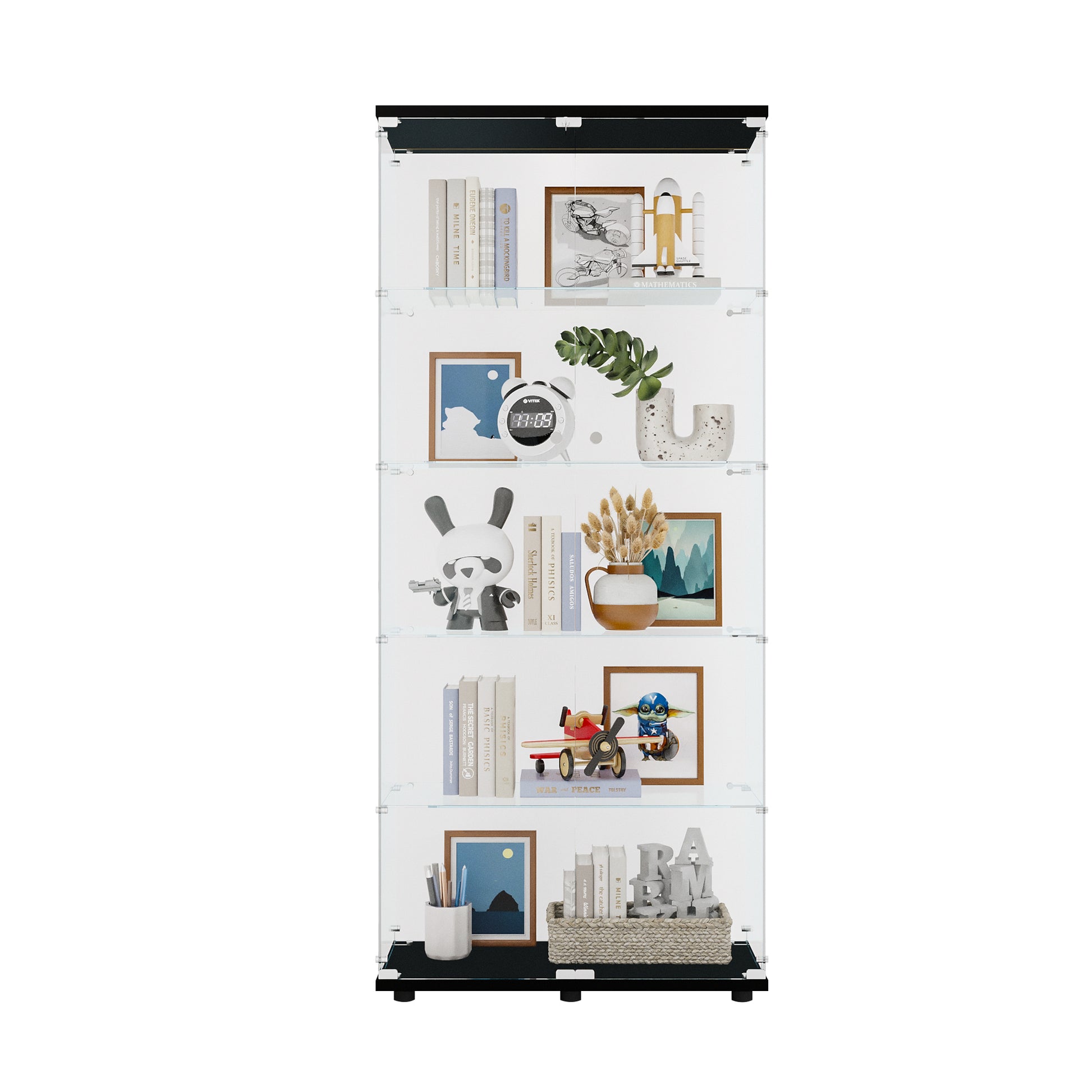 Glass Display Cabinet with 5 Shelves Double Door, Curio Cabinets for Living Room, Bedroom, Office, Black Floor Standing Glass Bookshelf, Quick Installation