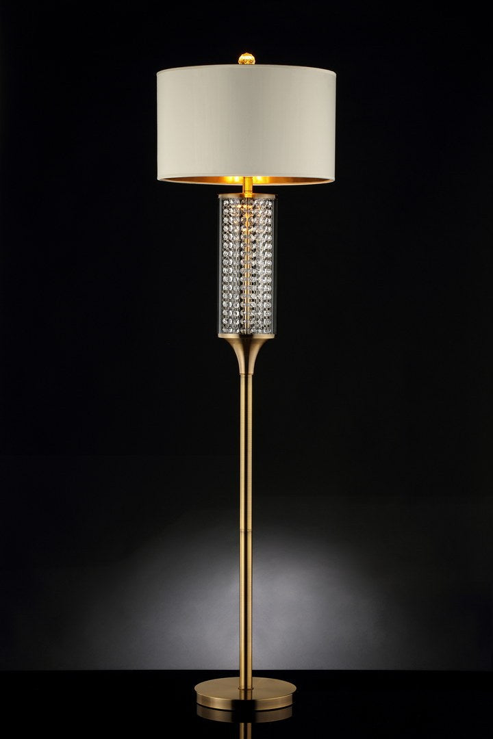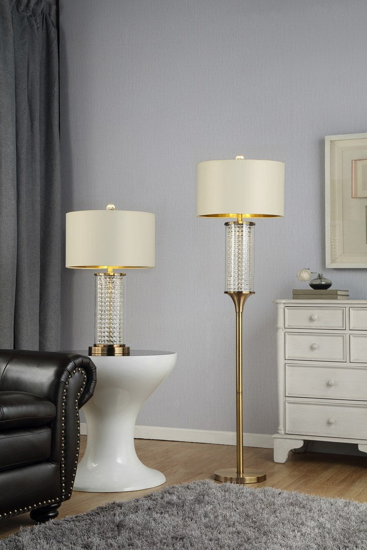 - Finish: Matte Gold, Clear Crystal, Clear Glass, off-white Drum w/ Gold Lining Shade. Bulbs: 1 x 100 W Type A B11 E26 Clear Incandescent, CFL or LED Bulb compatible (not included)