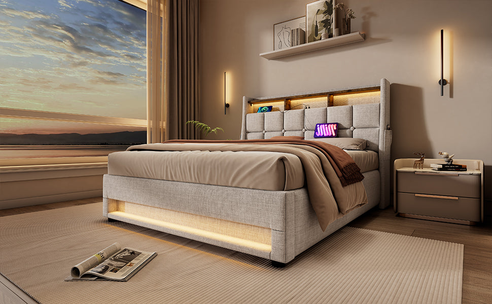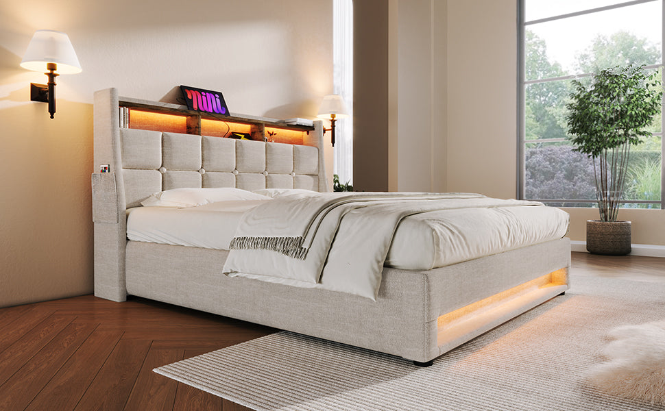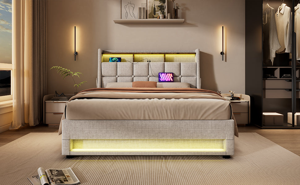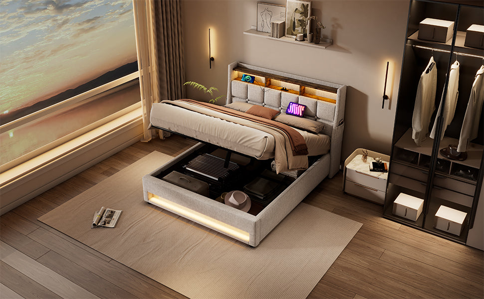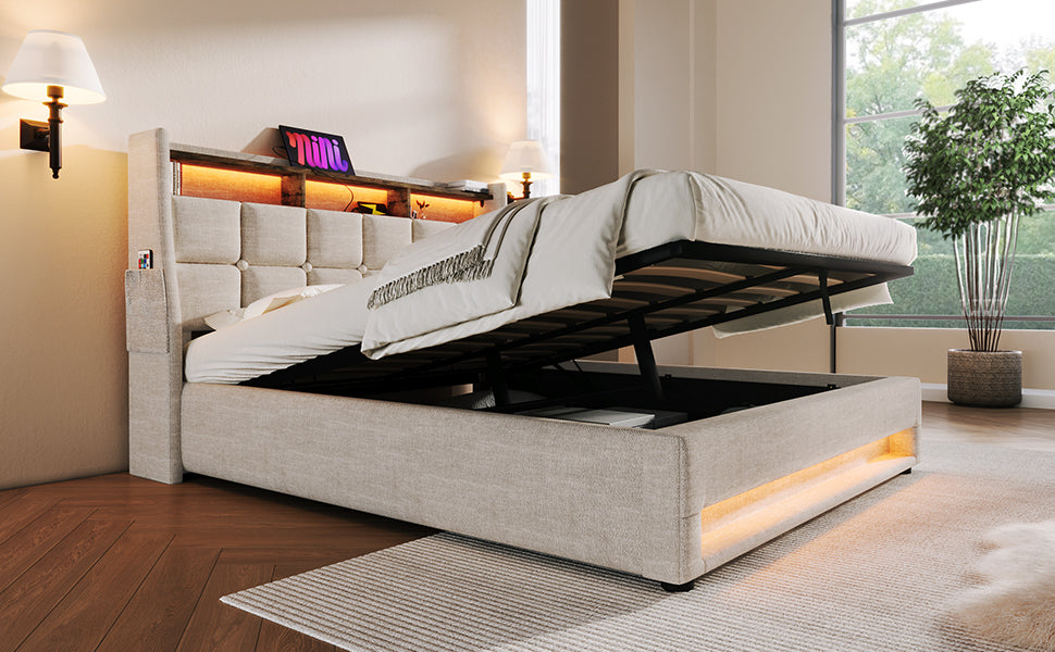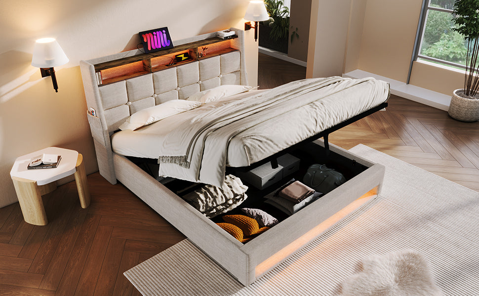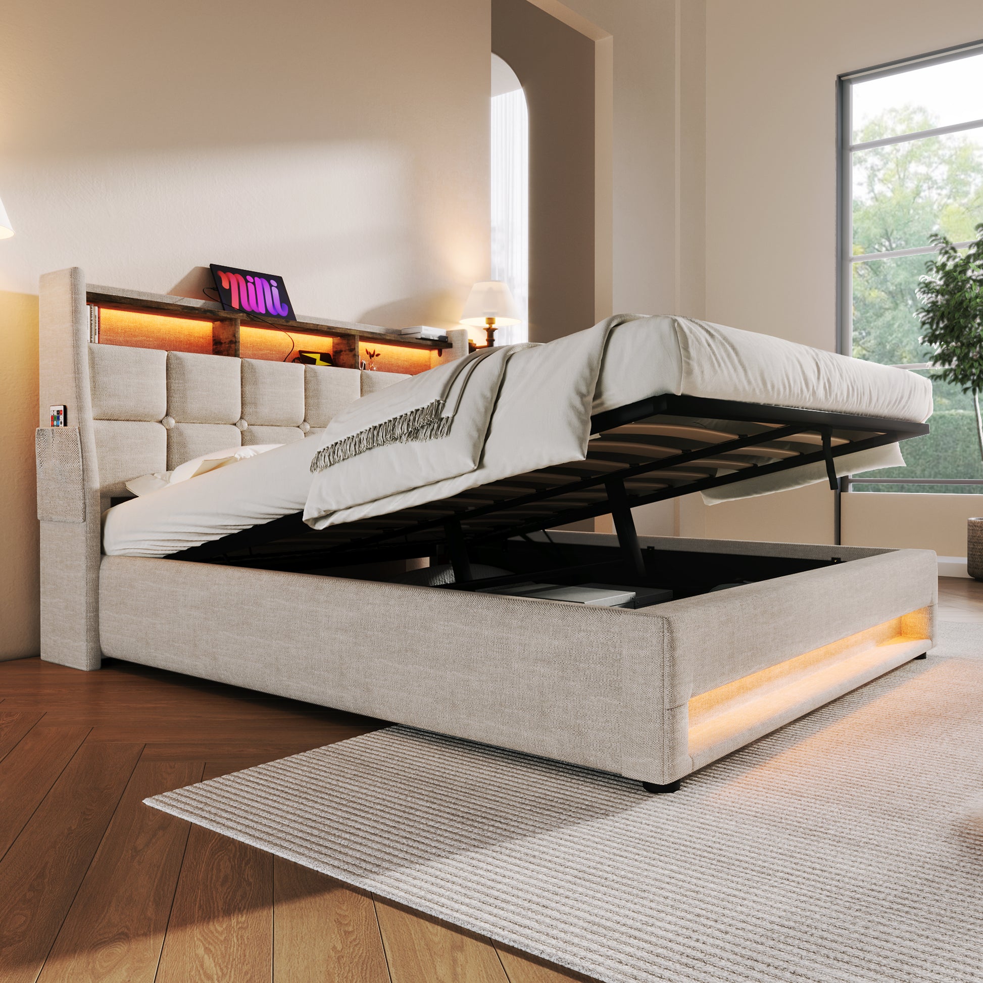 Full size Upholstered Platform bed with a Hydraulic Storage System, LED and USB Charging, Natural (without mattress)