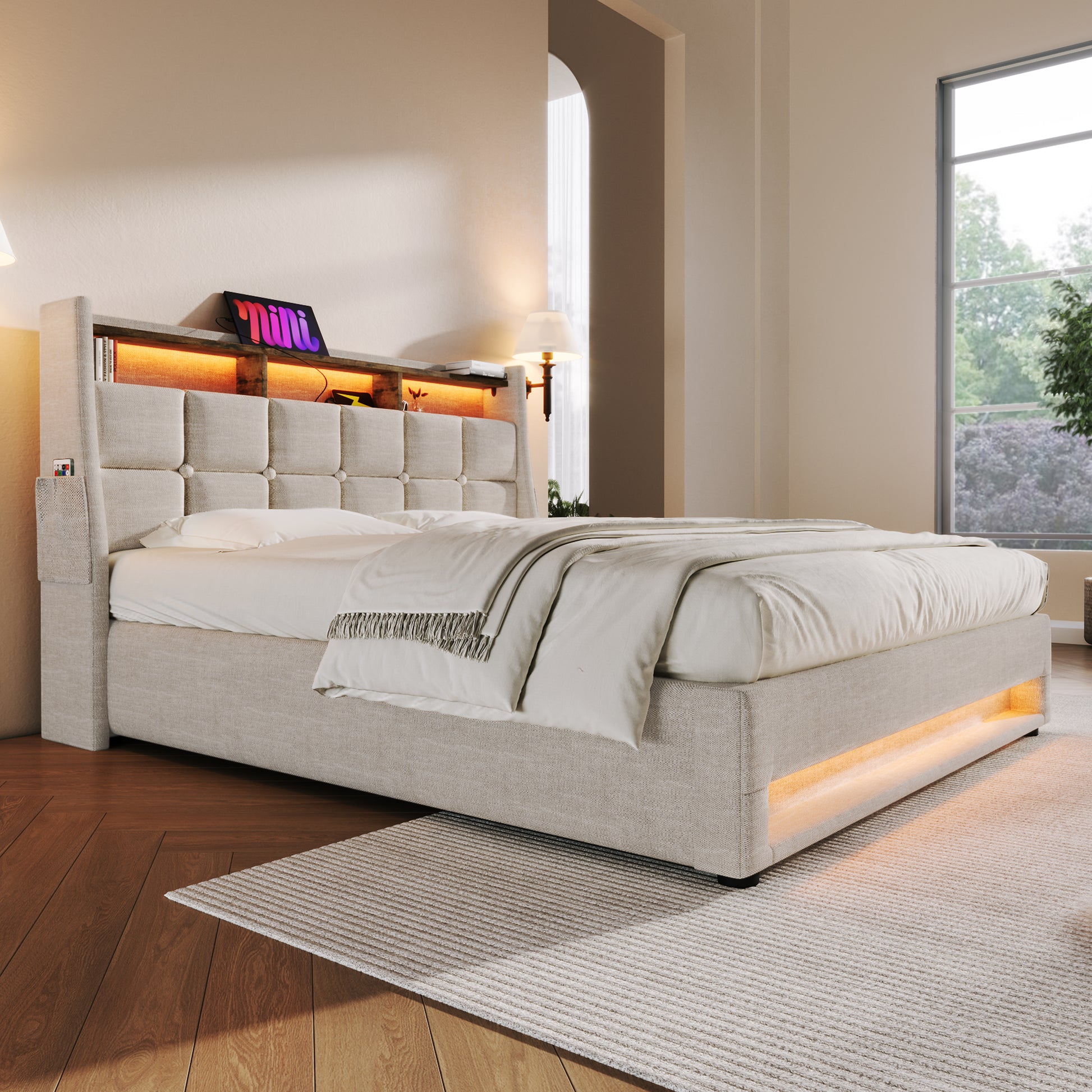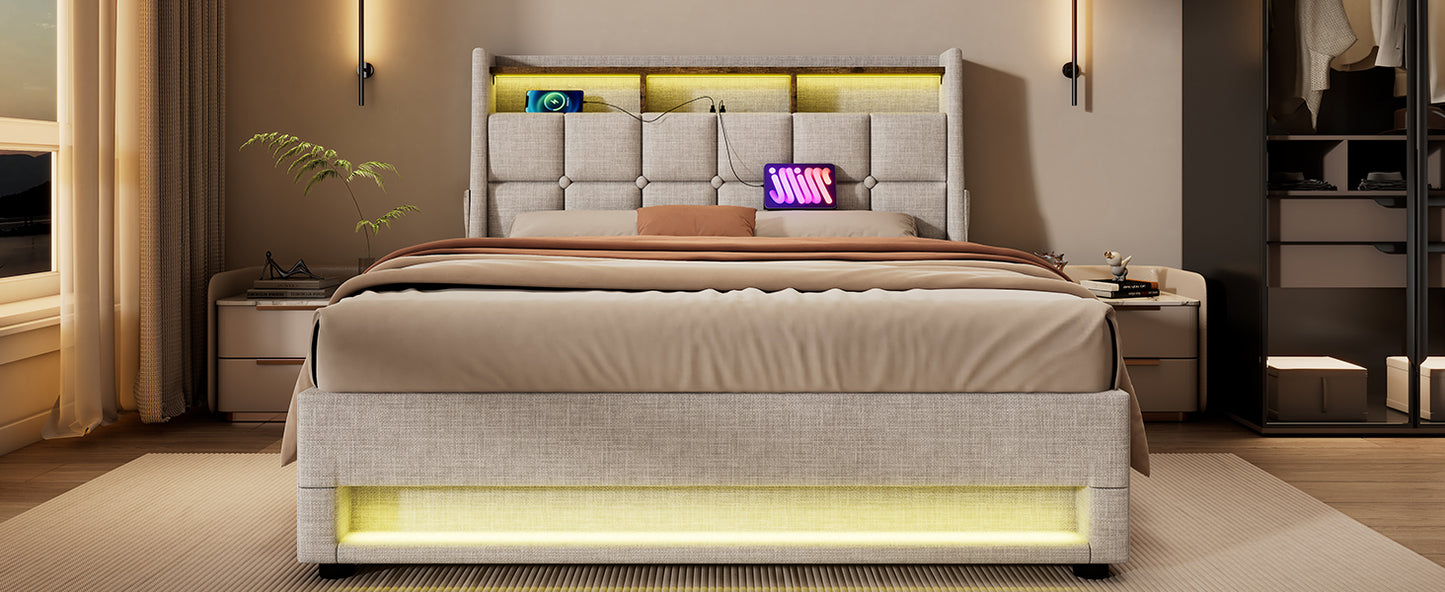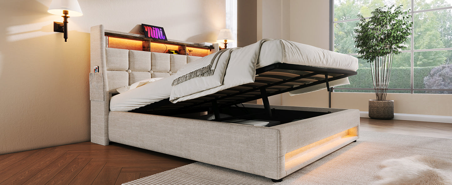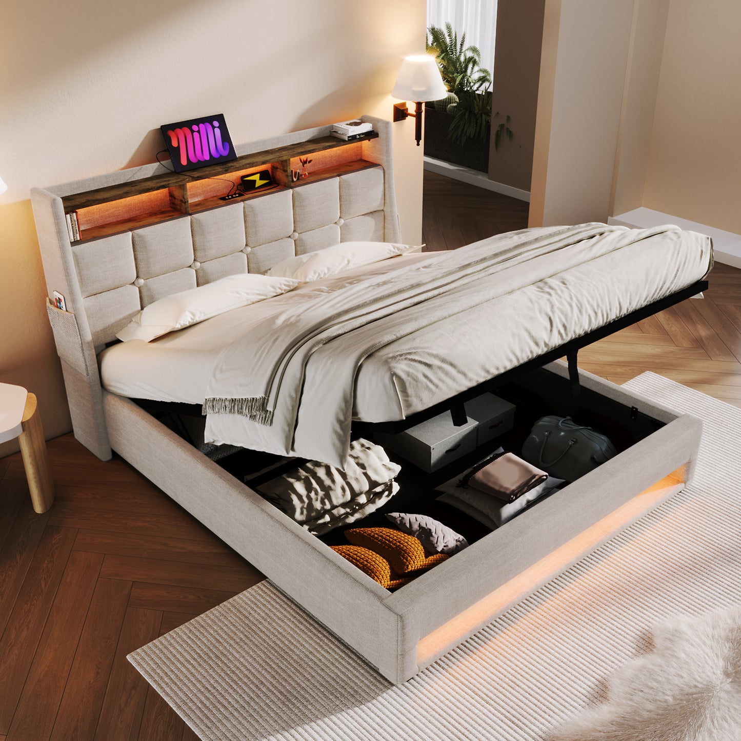 Full size Upholstered Platform bed with a Hydraulic Storage System, LED and USB Charging, Natural (without mattress)