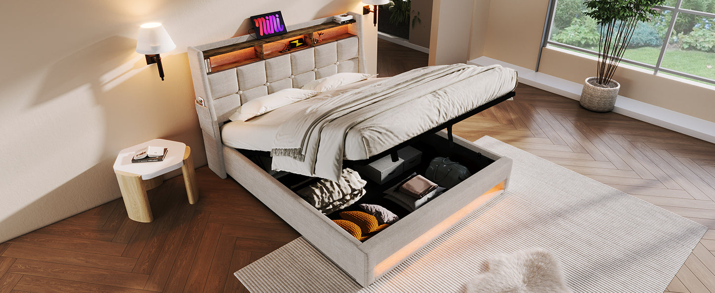 - Flexible and spacious storage: Experience ultimate convenience with our bed's versatile features. Keep your cell phones and tablets within reach on the shelf, while utilizing the hydraulic system for under-bed storage of large items. Additionally, enjoy easy access to magazines or remote controls with the convenient side pocket.