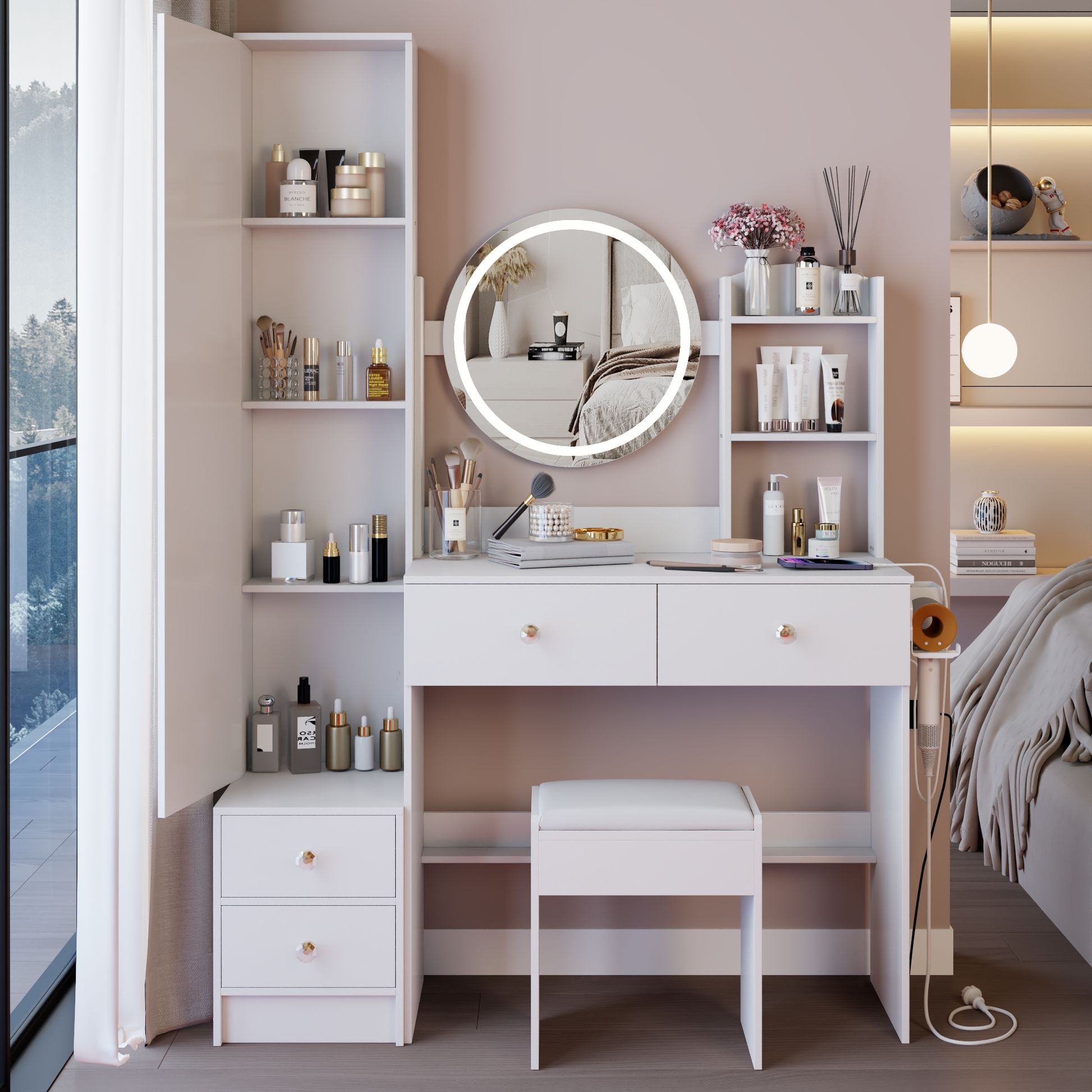 - [Full body mirror cabinet+vanity table+cushioned stool set]: Our set includes a full body mirror cabinet, a vanity table and a cushioned dressing stool. With one purchase, you receive all three items, saving you time and shipping costs.