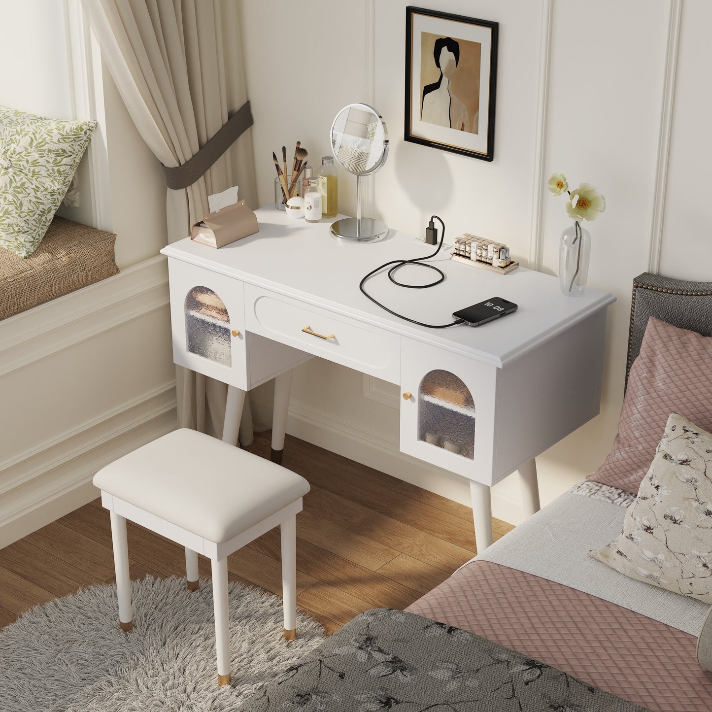 Elegant Vanity Makeup Table & Chair Set, Modern Dressing Table with Organizer, Writing Desk, Charging Port, White, Engineered Wood