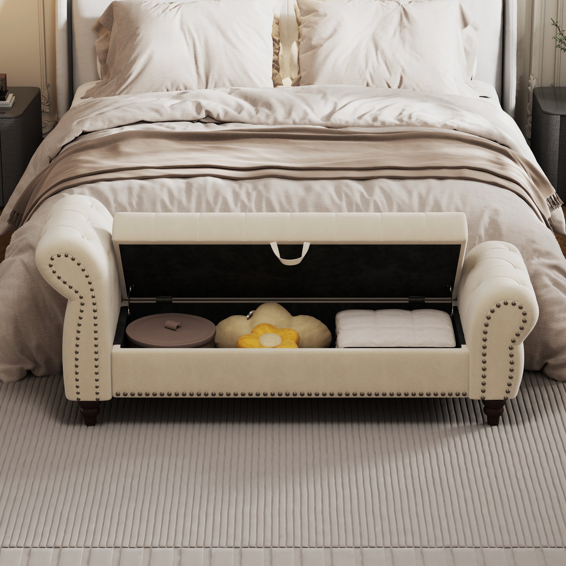 64.5' Bed Bench for Bed Room Nails Tufted Chaise of Lounge with Storage Velvet Upholstery Beige