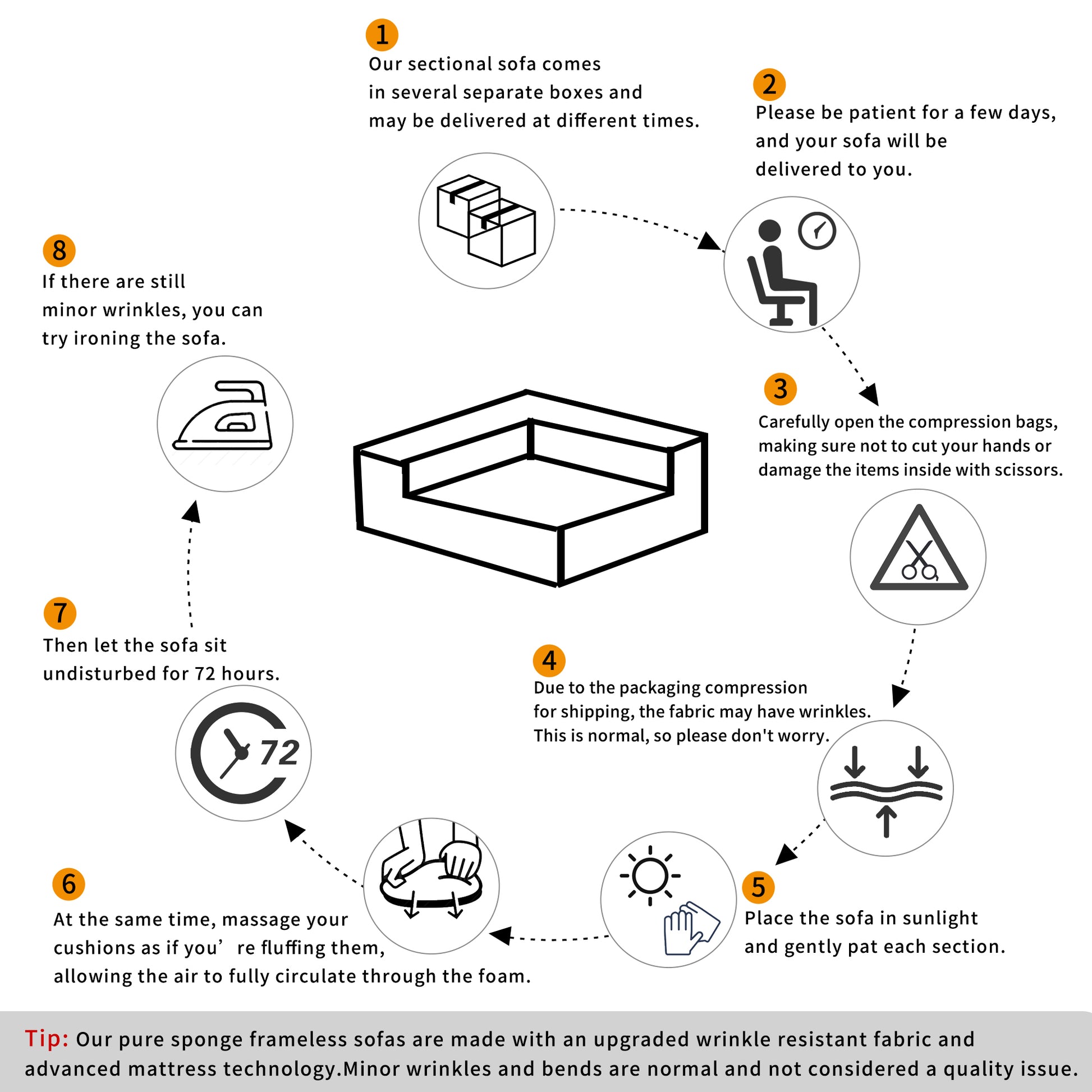 | TIP | Due to package compression for better shipment, the fabric may have wrinkles.Please take all packages out and pat every part to make it rebound better and fluffy, so that itcan restore to picture-like status. |