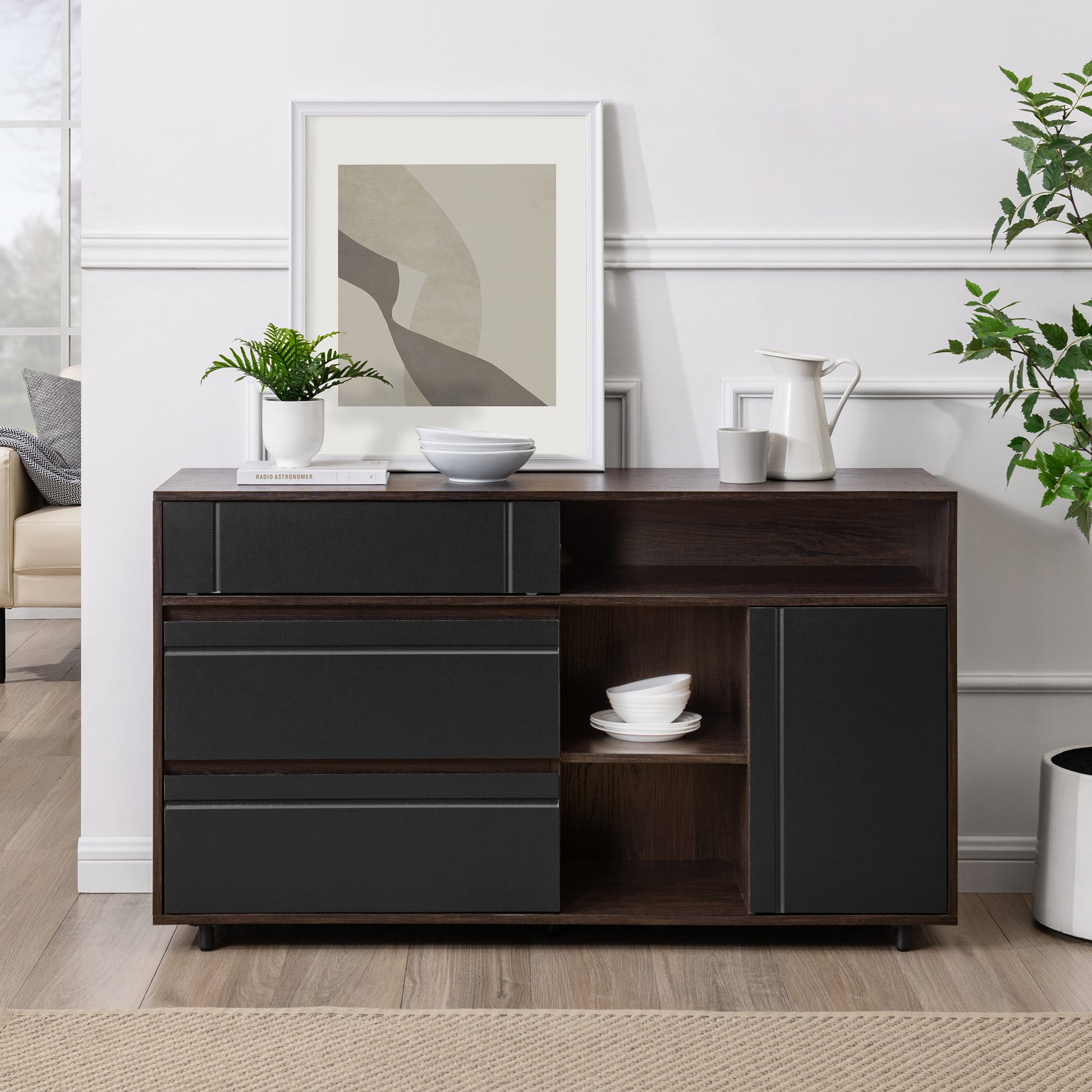Contemporary Detailed-Door Sideboard with Open Storage – Dark Espresso / Solid Black MDF