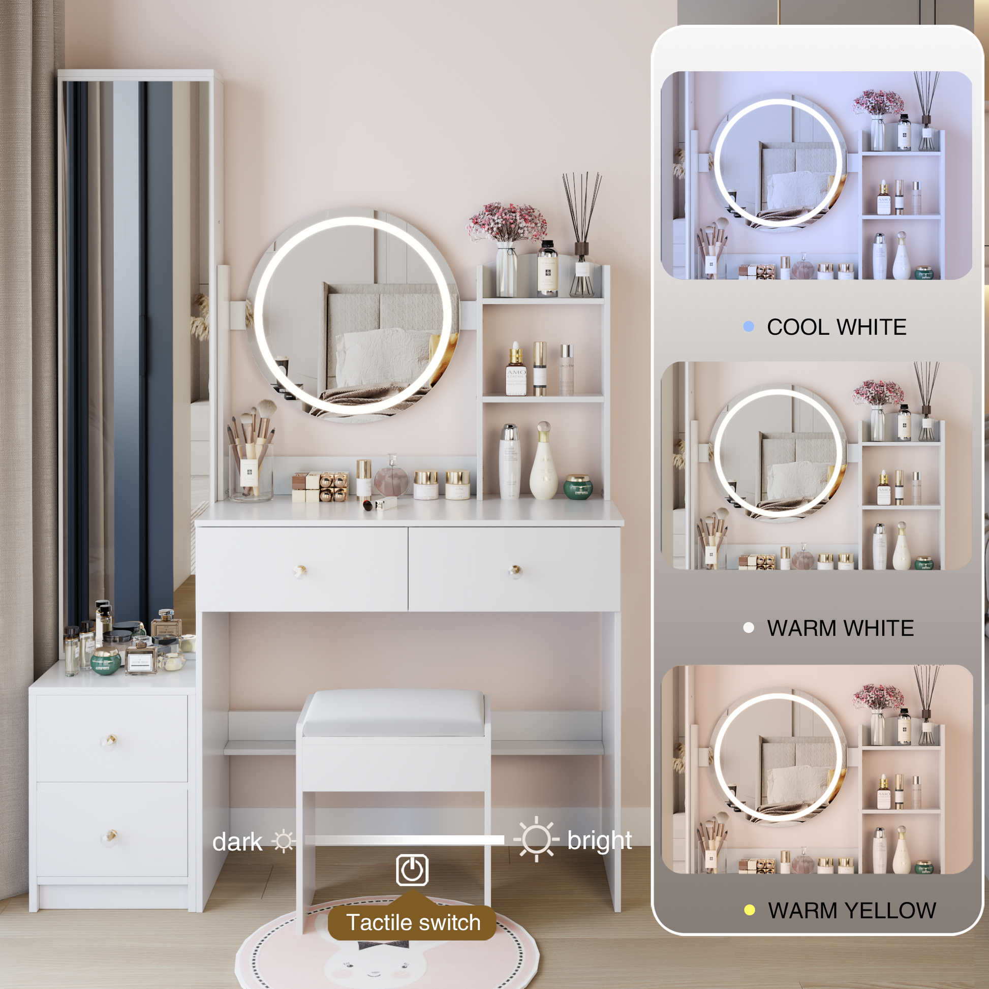 Full Body Mirror Cabinet + Round Mirror LED Vanity Table + Cushioned Stool, 17' diameter LED Mirror, Touch Control, 3-color, Brightness adjustable, Large Desktop, Multi-layer High Capacity Storage