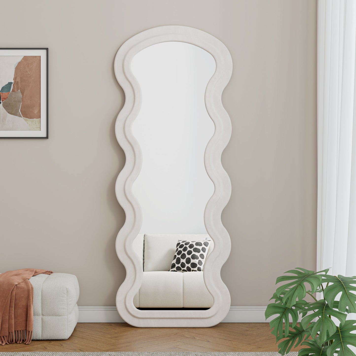 - Comfortable Flannel Fabric Touch:This is a clear and bright wavy full-length mirror, covered with flannel fabric, the wooden frame pad is wrapped with high-quality sponge, providing you with a soft and comfortable feeling. The wavy design adds an artistic touch to any room
