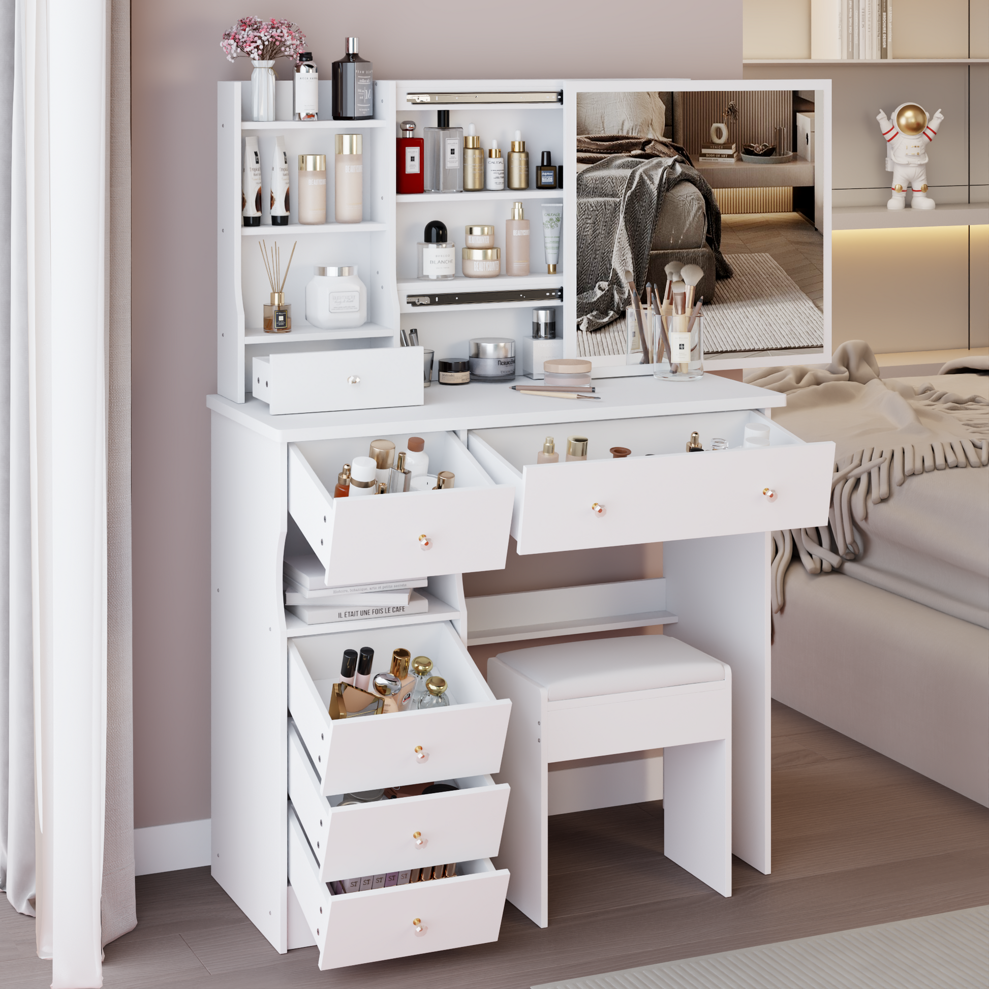 37' Middle Size Left Drawer Desktop Vanity Table + Cushioned Stool, Extra Large Right sliding mirror, Multi Layer High Capacity Storage, Practical Fashionable Dresser, Suitable For Large Space