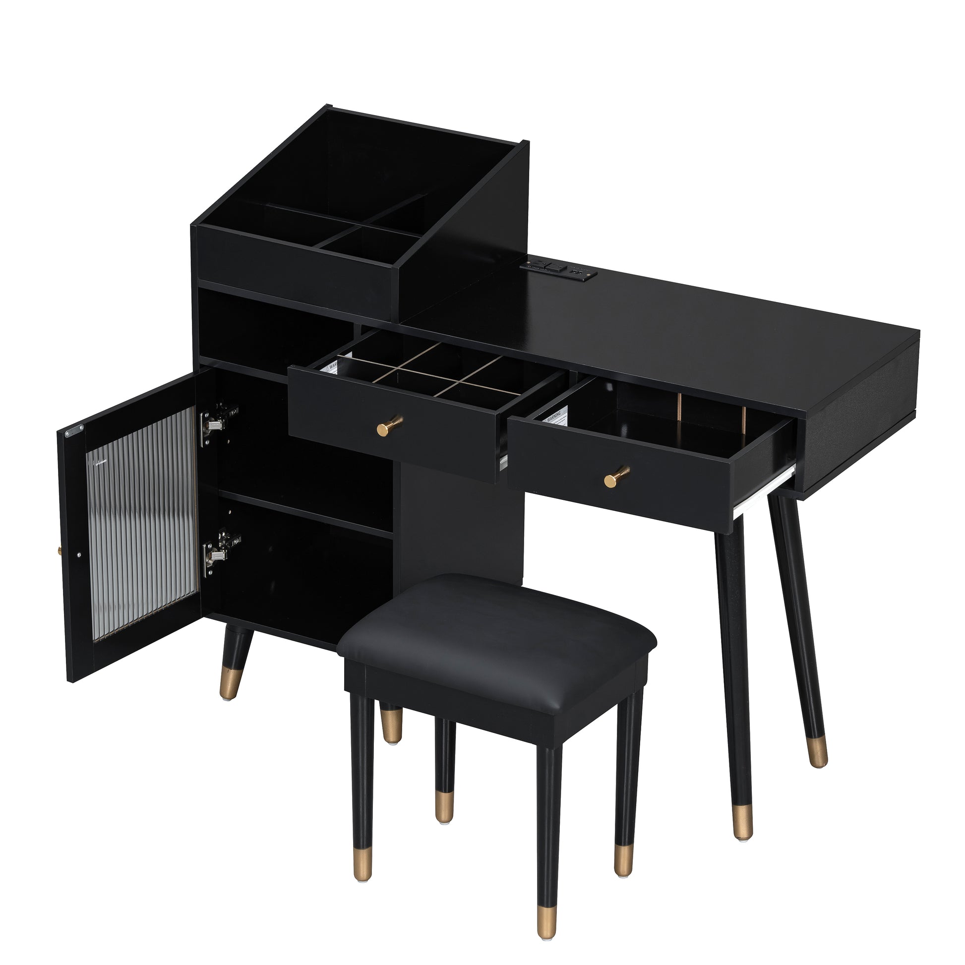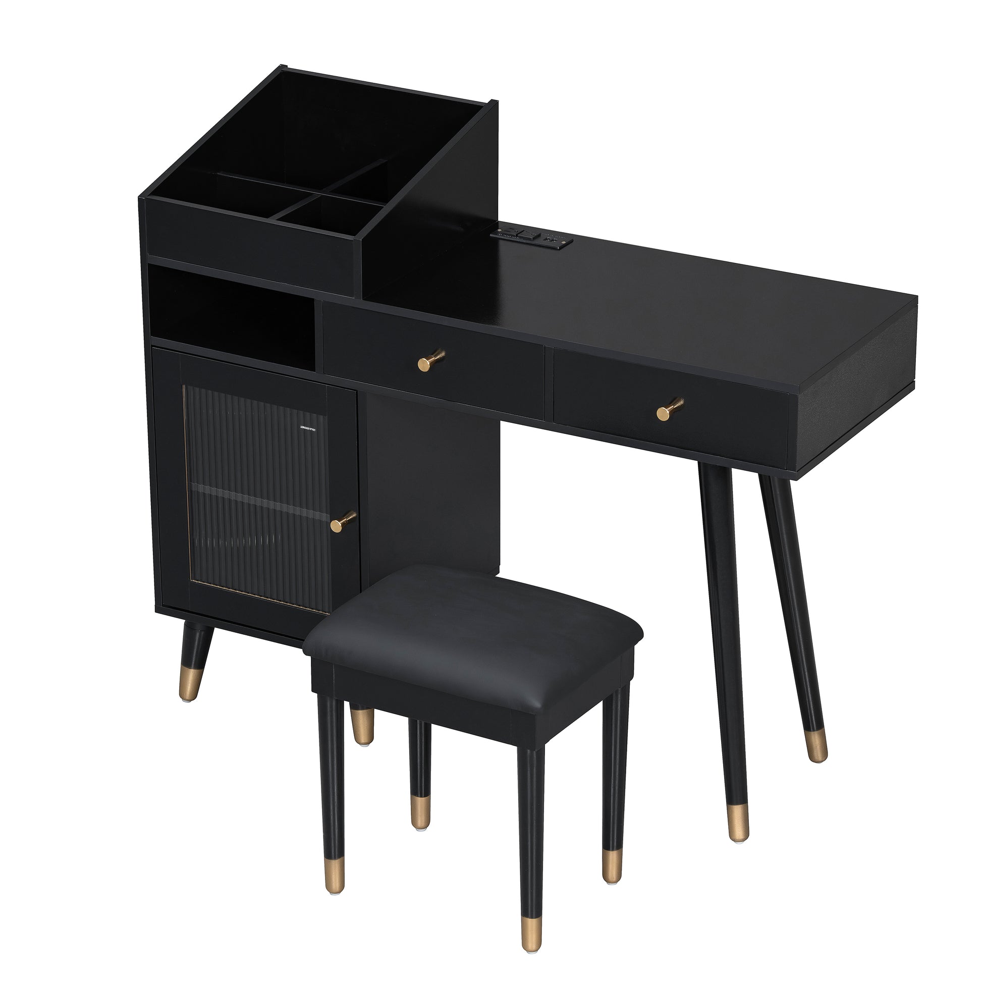Modern Makeup Vanity Desk with Drawers, Cabinet & Charging Port, Space-saving Dressing Table Set with Stool for Small Places, Black