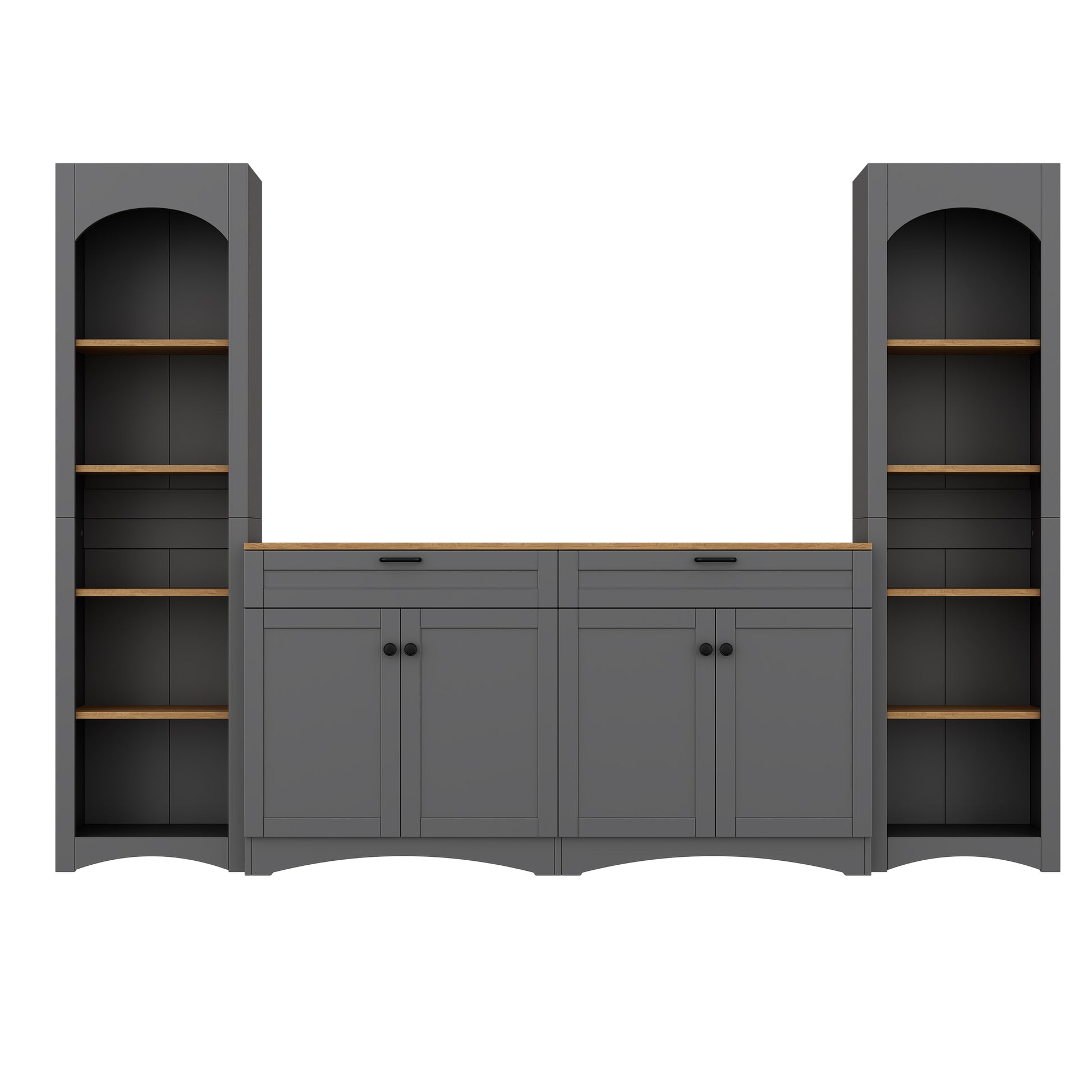 This entertainment center consists of three cabinets that can be put together to form a wall unit set, or individually placed in the living room, study, dining room, etc., serving as bookshelves or sideboard. With its versatile and configurations, it caters to your diverse needs and preferences.