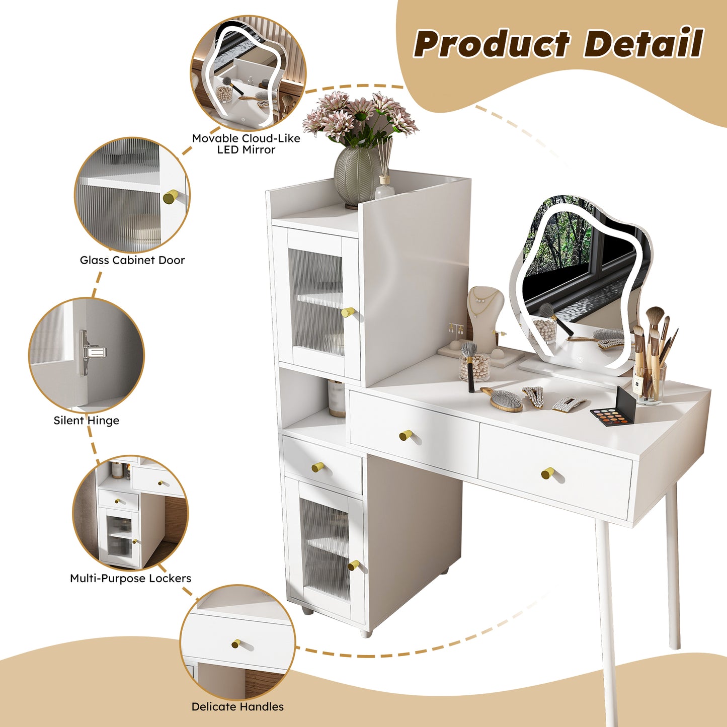 Vanity Dressing Table with LED Mirror & Storage – White Makeup Desk Features 3 Drawers, 2 Open Shelves & 4 Hidden Cabinets (Transparent Doors) - 3 Adjustable Lighting Modes - Ideal for Bedroom or Livi