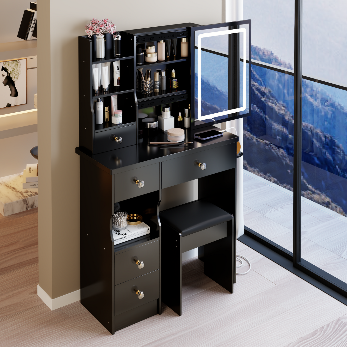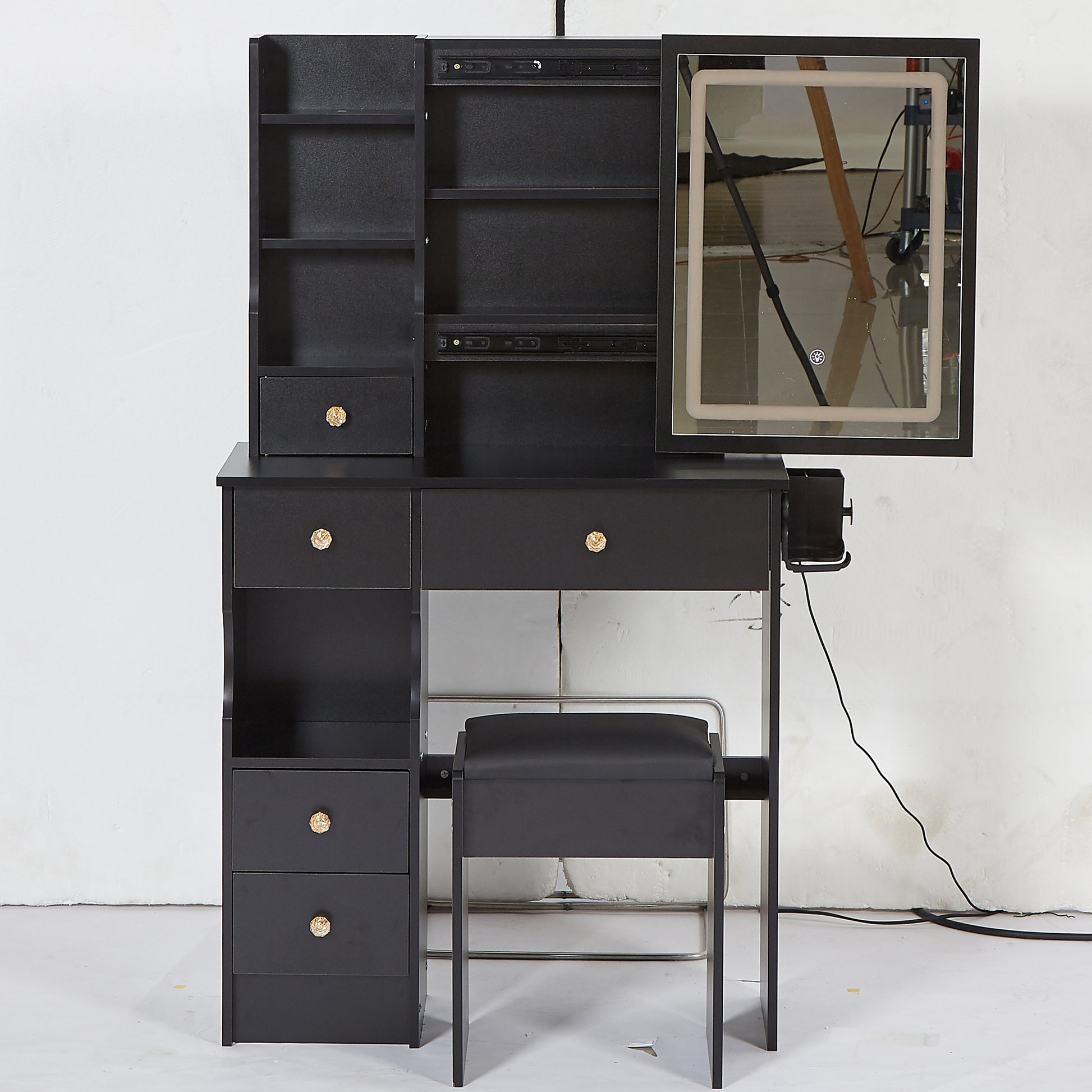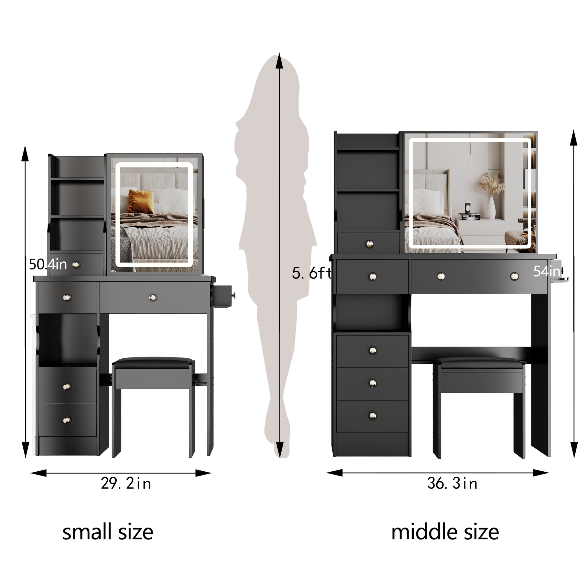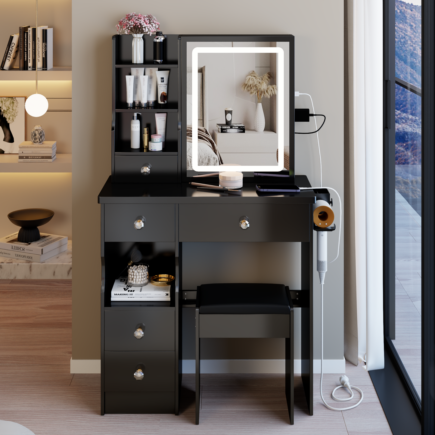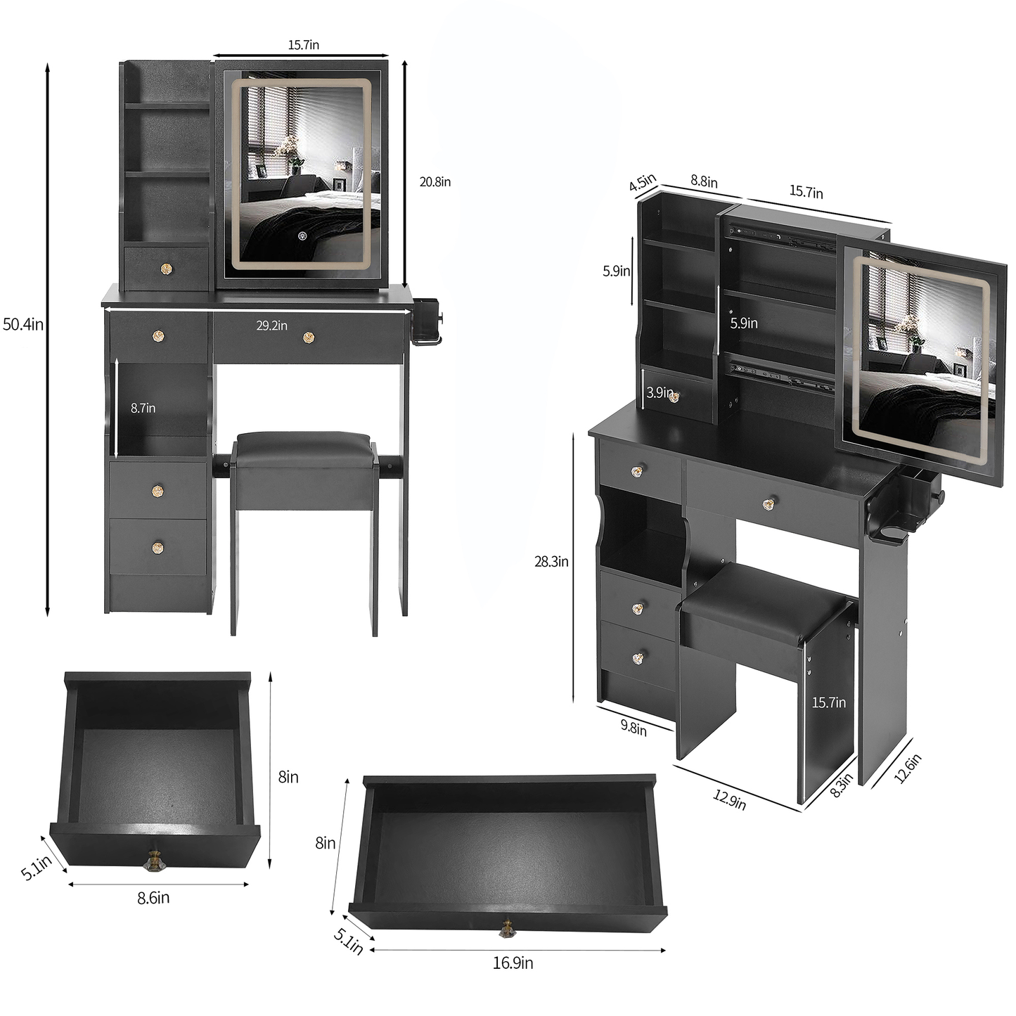 29.2' Small Size Left Drawer Desktop Vanity Table + Cushioned Stool, 2 AC+2 USB Power Station, Hair dryer bracket, Extra Large Touch Control Sliding LED Mirror, Tri-color Switching, Brightness Adjust