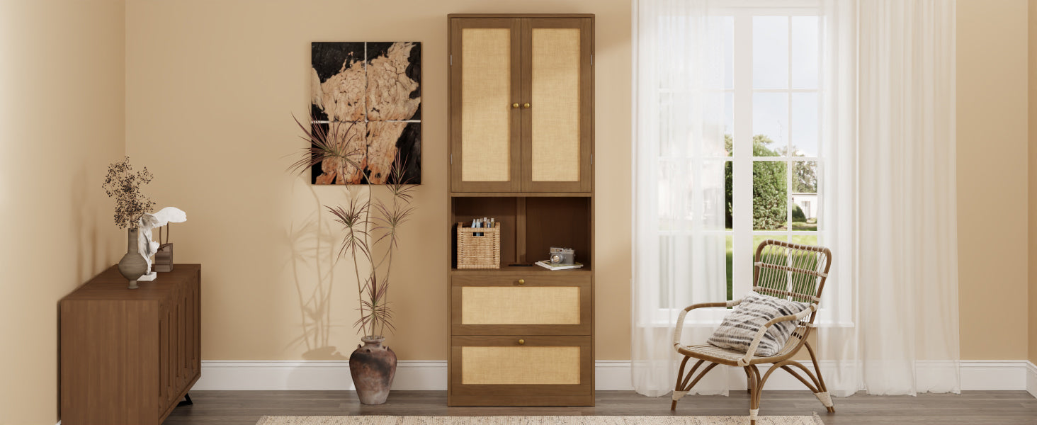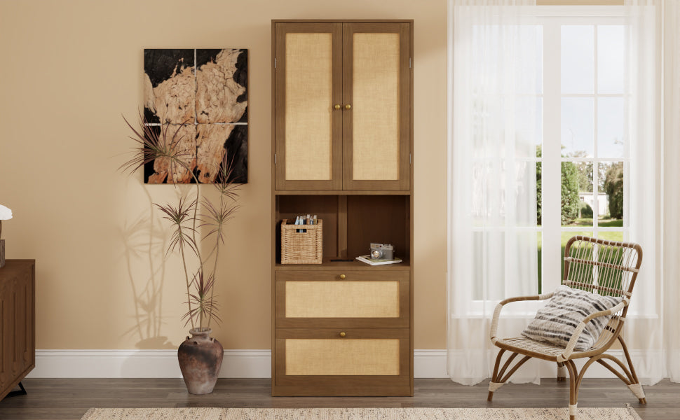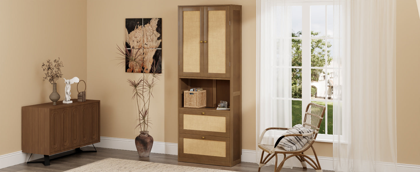 - Delicate Rattan Design: This storage cabinet is a combination of aesthetic beauty and great practicality. Featured stylish rattan doors, this cabinet not only can storage belongings, but also can be a decor, add charming to your home.