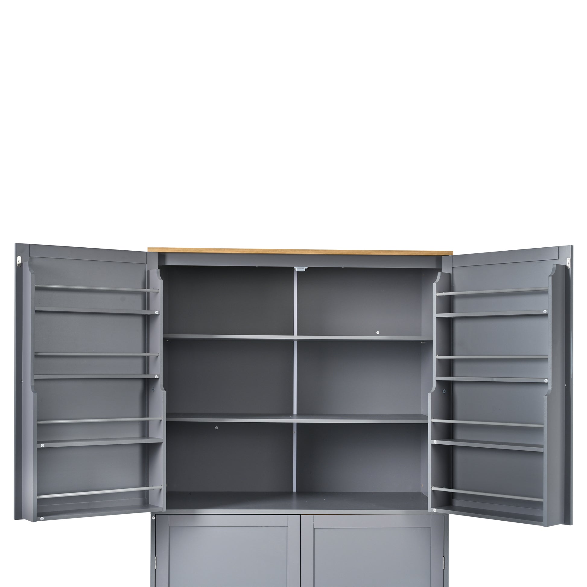 - [8 Door Storage Shelves]This elegantly designed 4 doors kitchen pantry includes two upper doors, each opening to reveal 4 door shelves that cleverly maximize storage space. The shelves are thoughtfully varied in height(from 5.9” to 8.7”), making it easy to store items ranging from tall bottles to small jars. For added convenience and safety, removable barriers are installed to ensure nothing slips out accidentally.