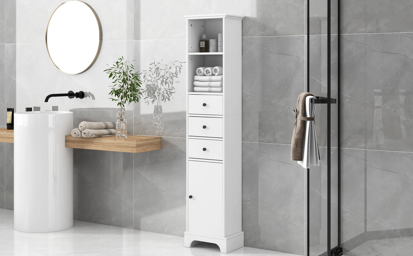 White Tall Bathroom Cabinet, Freestanding Storage Cabinet with 3 Drawers and Adjustable Shelf, MDF Board with Painted Finish