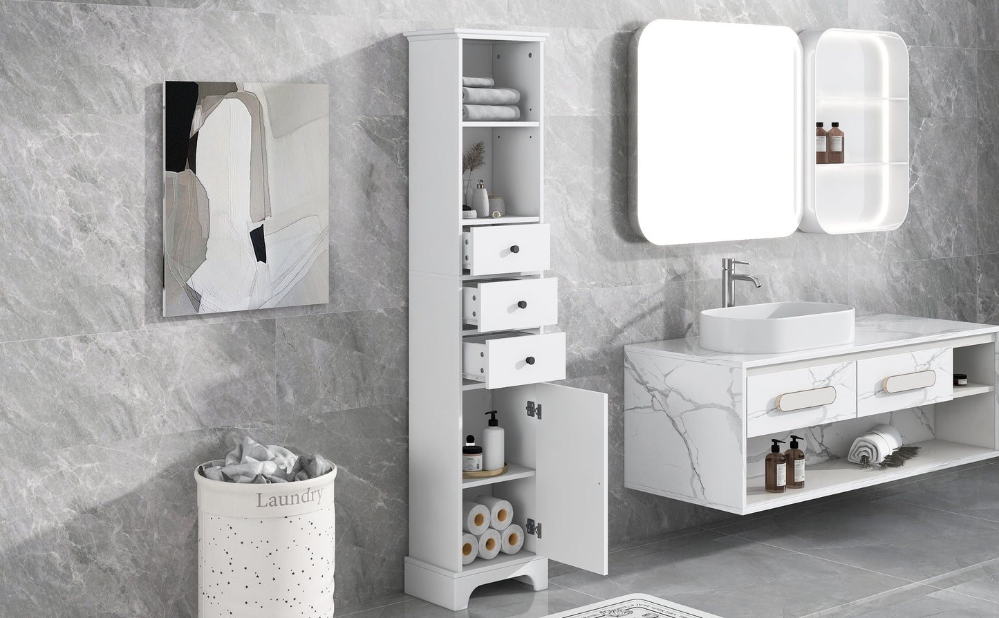 - Adjustable Shelves: The shelf of this cabinet can be adjusted into three different heights and to hold items in different size. You can put shampoo, towel, body lotion, tissues and storage basket etc., which totally satisfies customers' different needs.