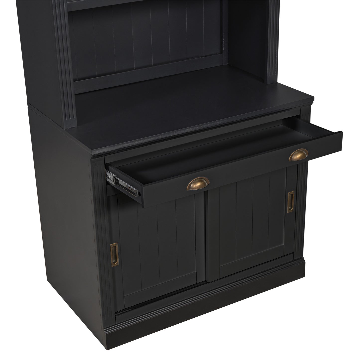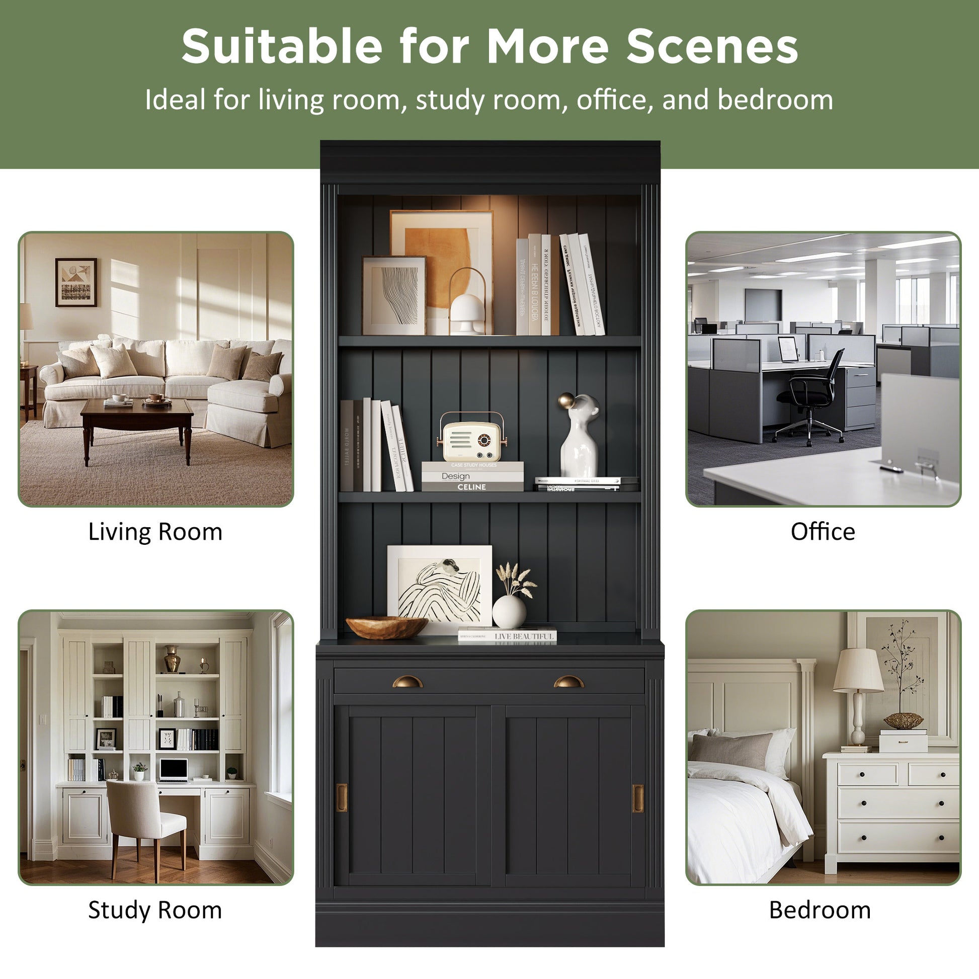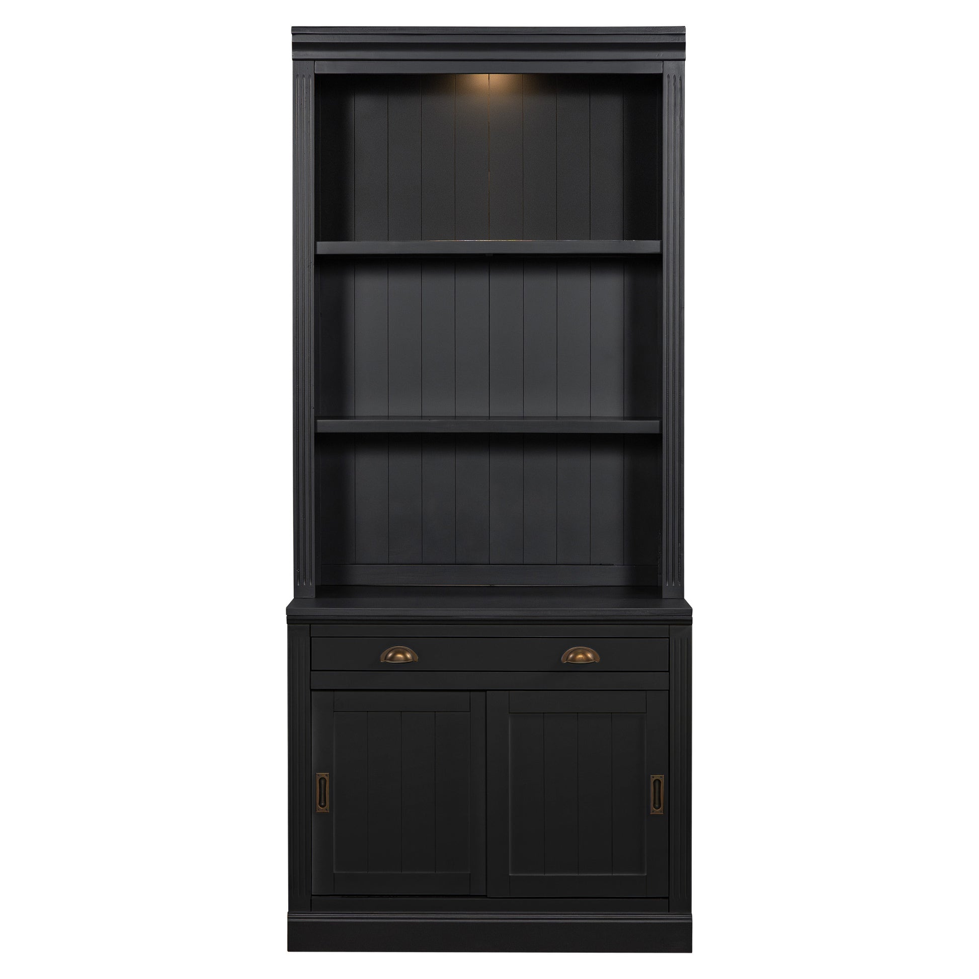 83.4'Tall Bookshelf with LED Lighting, Modern Bookcase with Sliding Doors and Open Shelves,Storage Bookshelf for Living Room,Home Office,Black