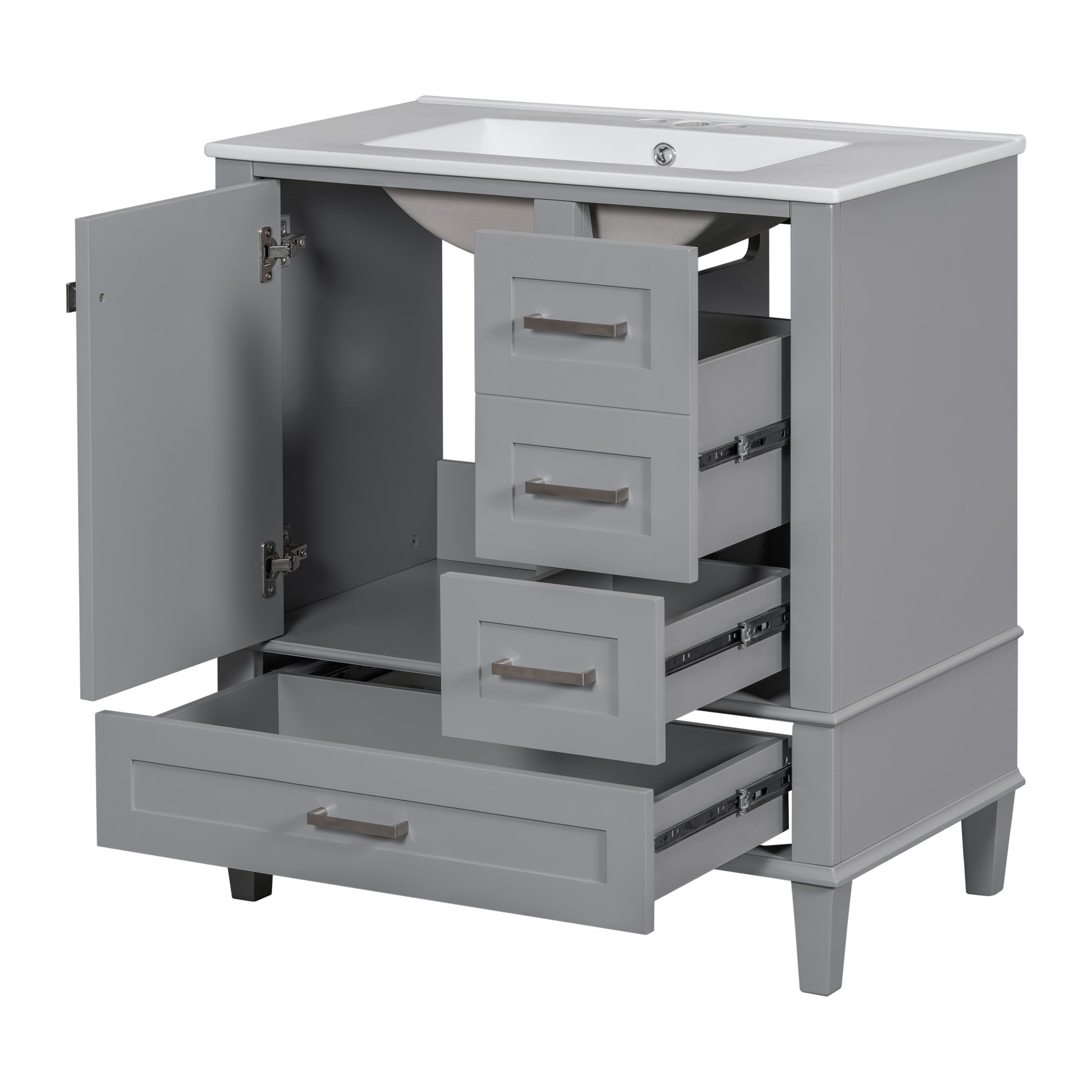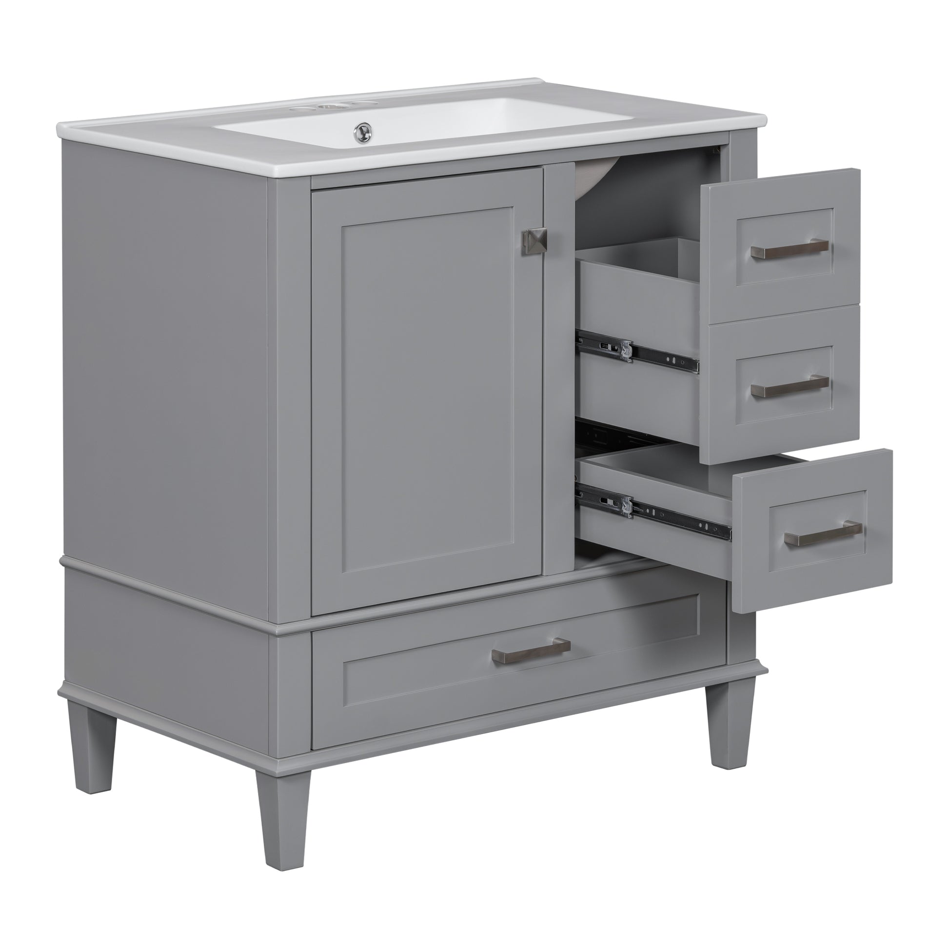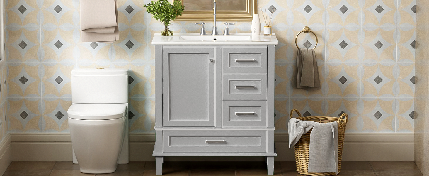 - [Keep Your Bathroom Organized]Equipped with a 30' sink, this bathroom vanity provides ample storage space, featuring 1 cabinet and 3 drawers of different depths and widths, perfect for neatly organizing various bathroom essentials, keeping your bathroom tidy and clutter-free.