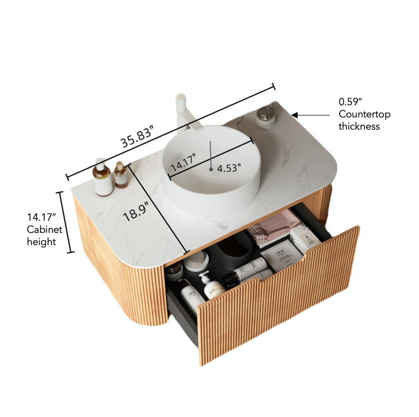 DINA 36' Bathroom Vanity with Sink, Wall-Mounted Floating Curved Edges Striped Bathroom Storage Cabinet with a Drawer, White Round Ceramic Basin without Faucet, Pre-assembled, Natural Woodgrain Color