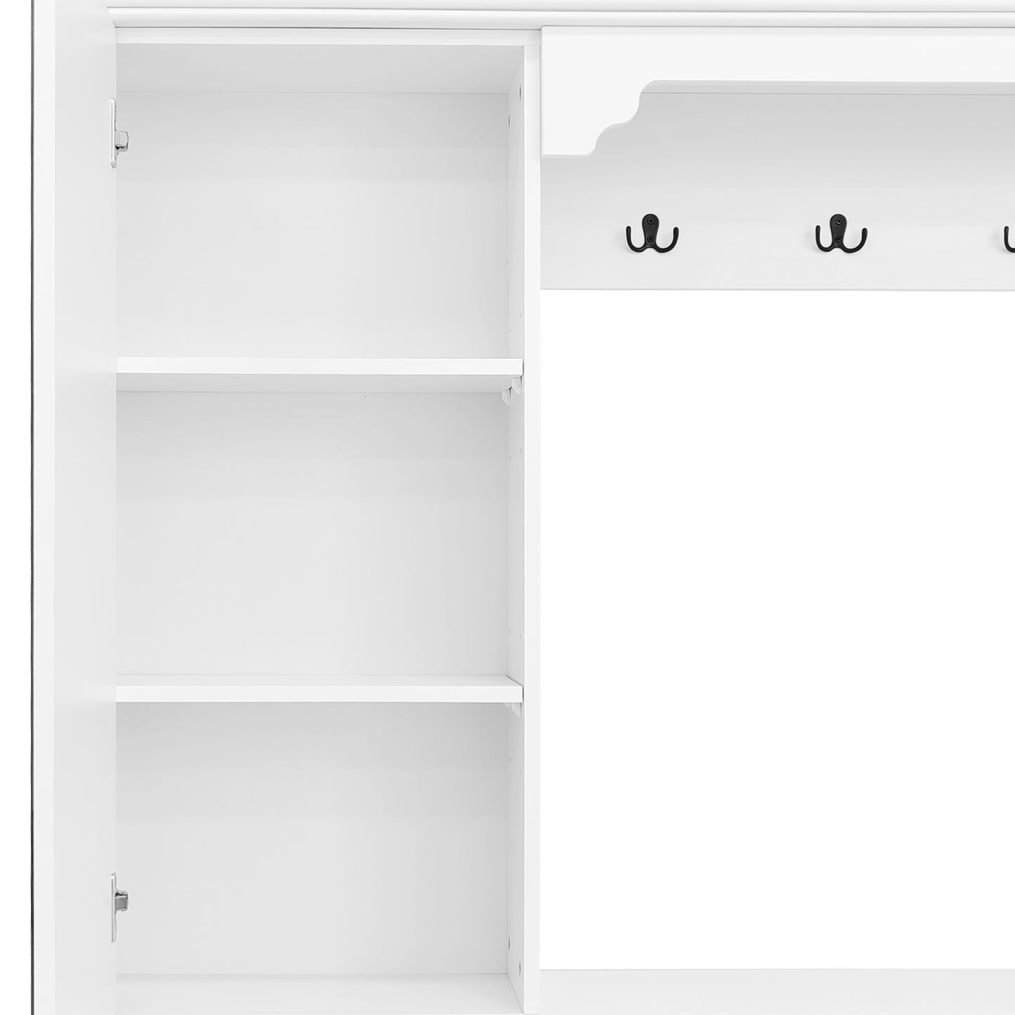 - The unit integrates the functions of coat racks, a shoe cabinet, and a mirror, offering a cohesive storage and grooming solution. It efficiently meets diverse daily needs, such as hanging up your outerwear, neatly storing shoes of various sizes, and quickly grooming yourself with the built - in mirror right upon entering your home. This multifunctional piece delivers a convenient one-stop solution for organizing personal items and tidying up your appearance when coming and going.