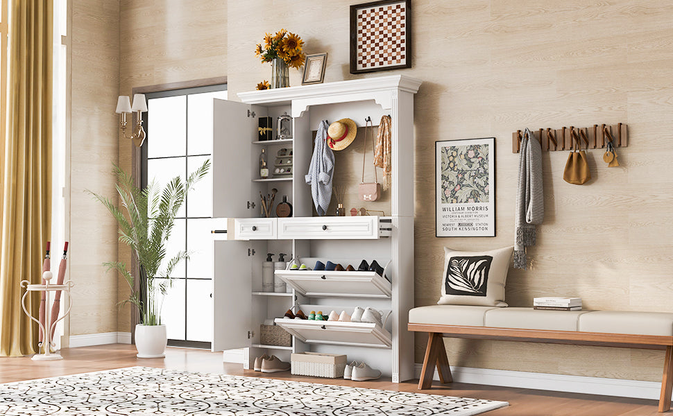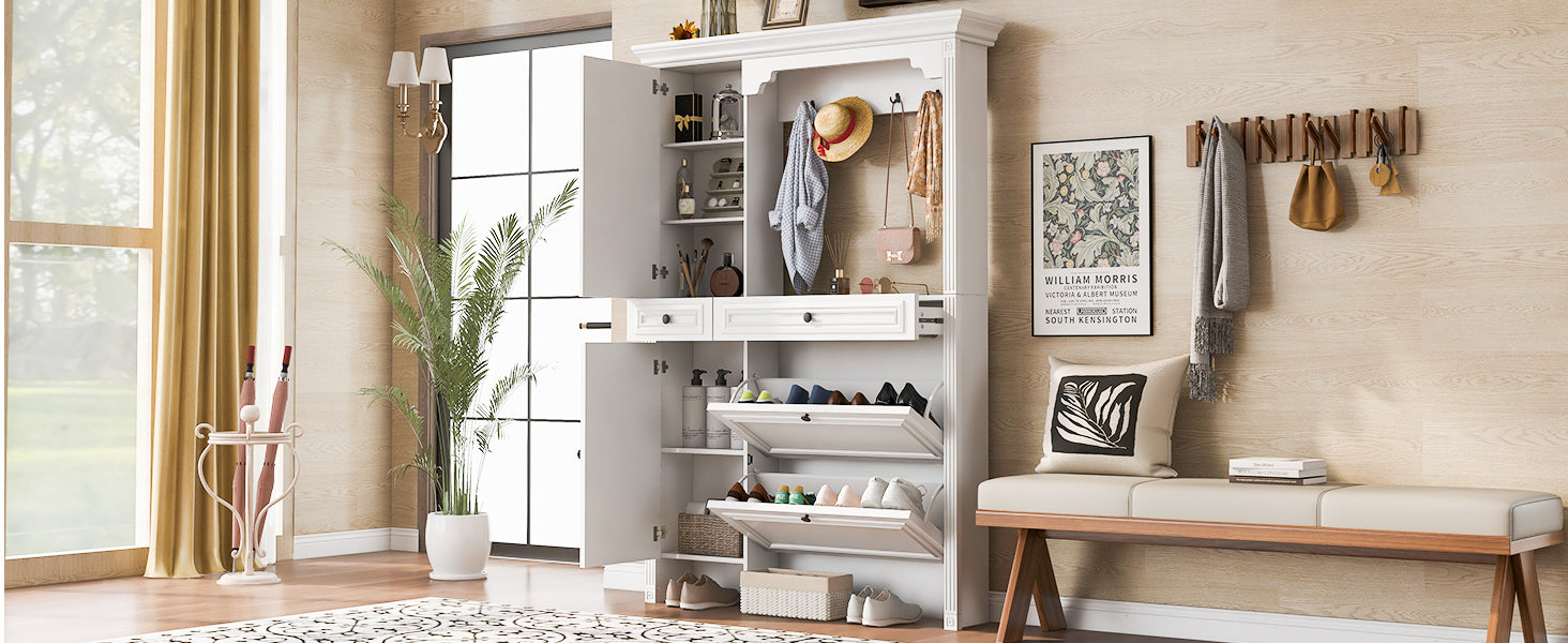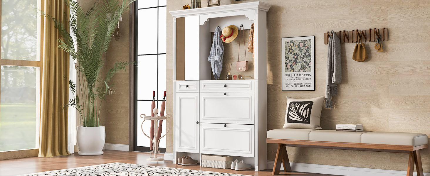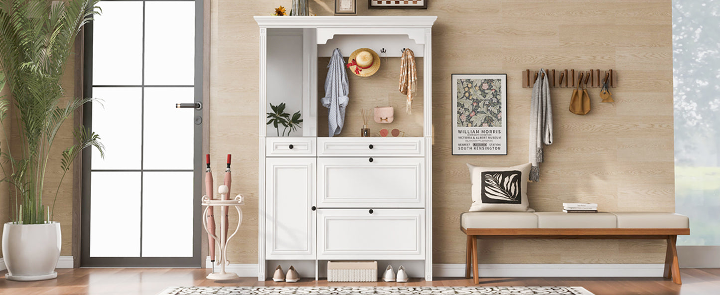 This all-in-one entryway unit seamlessly combines a coat rack, shoe cabinet, and mirror. Its innovative flip bucket shoe cabinets maximize space efficiency, allowing for easy access to footwear without cluttering the floor. The unit features 2 drawers, 2 storage cabinets with adjustable shelves, and dedicated compartments, providing ample room to neatly organize shoes, keys, bags, and other essentials. Four sturdy hooks are perfect for hanging coats, hats, and scarves. For peace of mind, it comes with an anti-tip device, and the clear instructions make assembly a breeze, making it a functional and space-saving addition to any home.