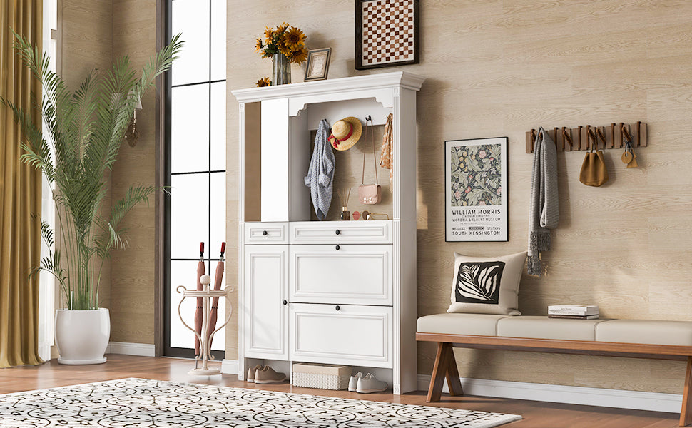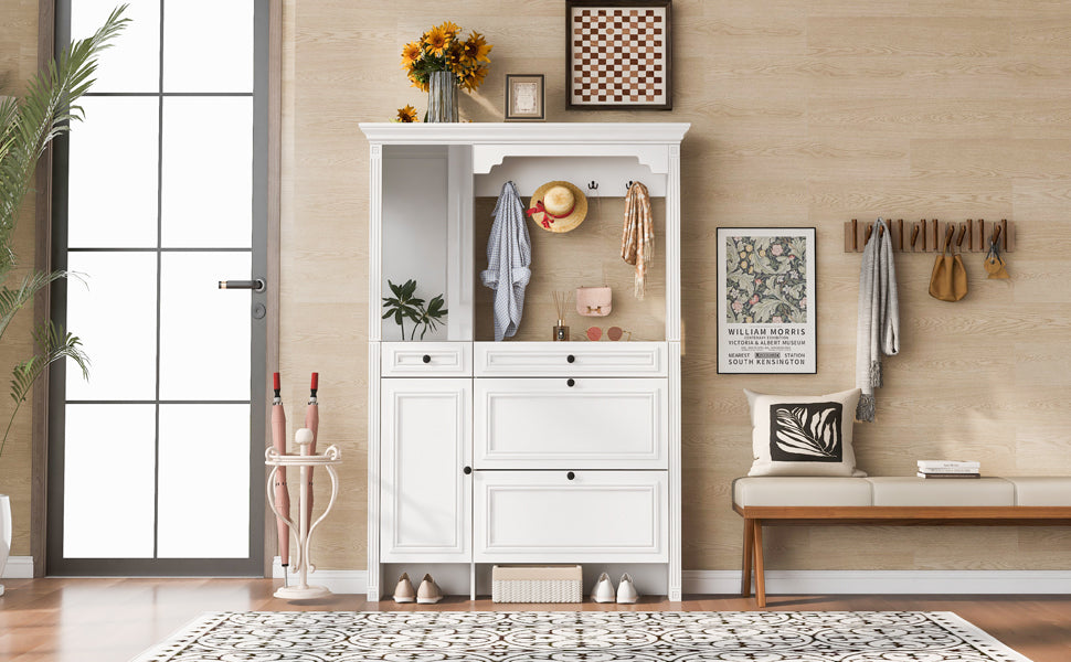 U-Can 54.7'' Hall Tree with Integrated Shoe Cabinet and Mirrored Cabinet Door, Coat Hanger, Entryway Bench, 4-in-1 Design, 2 Flip Drawers, 4 Hooks and 2 Cabinets for Entrance,Living Room