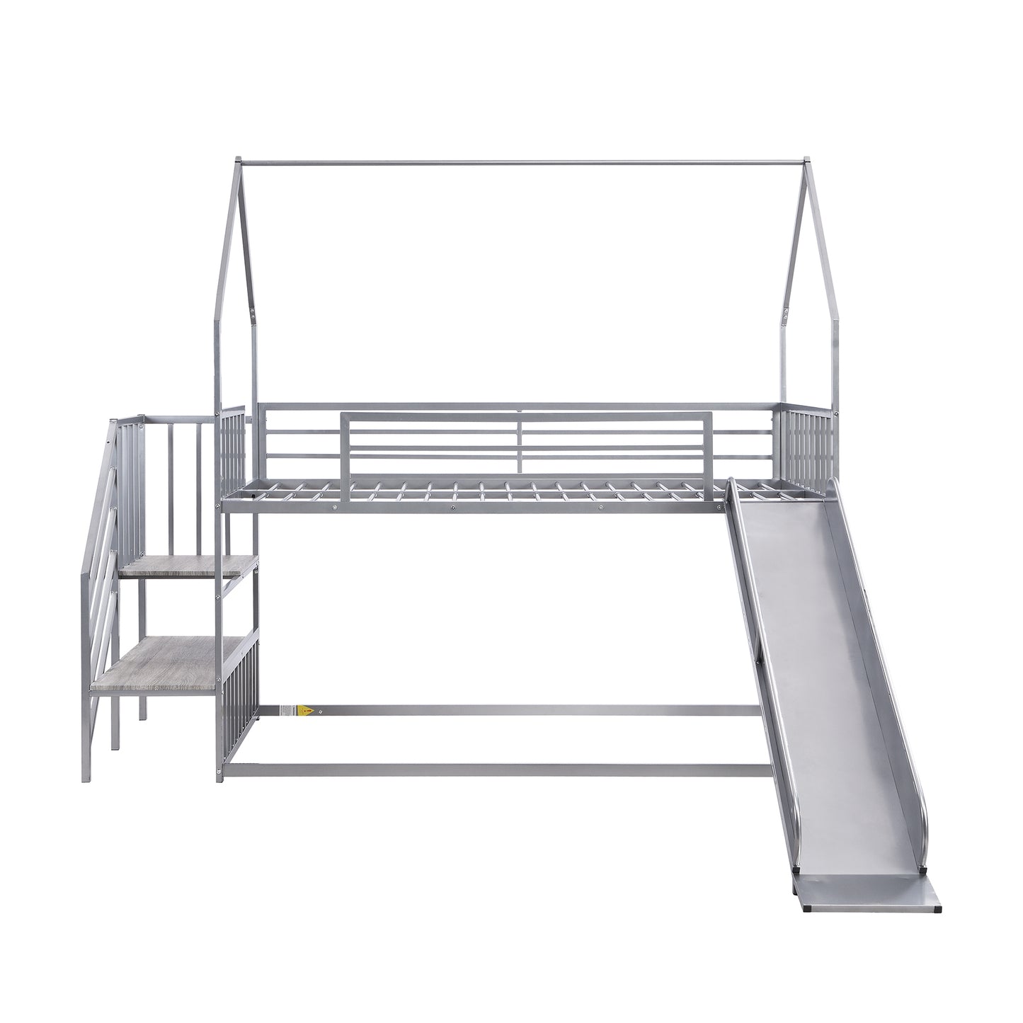 Twin over Twin Metal Bunk Bed House Bed with Slide and Staircase, Silver